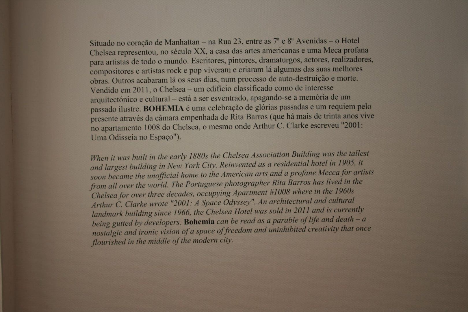 Rita Barros falou sobre o seu trabalho, explicando que a sua intenção foi mostrar o Chelsea Hotel, por dentro e por fora. Uma forma da fotógrafa apresentar ao mundo “um bocado da sua história”, já que Rita viveu nesse espaço há mais de 30 anos. Rita Barros deixou ainda um agradecimento a Jorge Calado, pelo desafio lançado para fazer esta exposição.