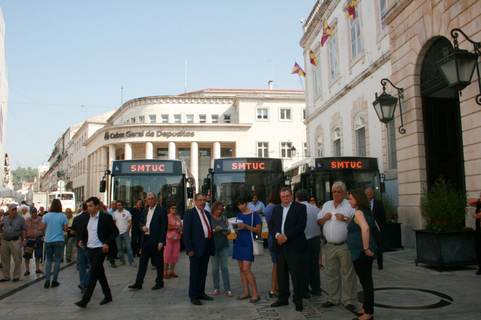 Quem passou hoje na Praça 8 de Maio deparou-se com cinco autocarros de transporte urbano de passageiros, dos Serviços Municipalizados de Transportes Urbanos de Coimbra (SMTUC), estacionados em frente à Câmara Municipal de Coimbra (CMC). Estes novos autocarros fazem parte do investimento de quase um milhão de euros que a CMC fez na sua compra e que Manuel Machado, presidente da CMC, fez questão de apresentar à população de Coimbra.