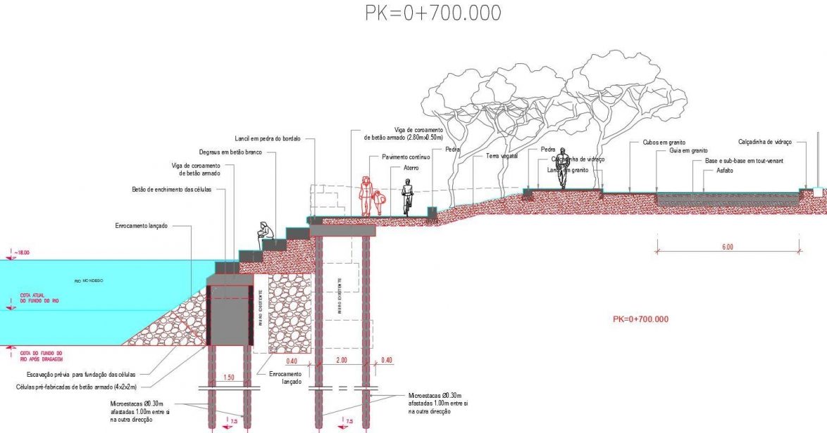 Prevê-se a implantação de um passadiço em estrutura metálica à cota do patamar inferior das escadas, de modo a permitir continuidade de circulações. É já próximo da estação de comboios que se inicia o rebaixamento do muro e a consequente definição de espaços de circulação a cota mais baixa, aproximando-se do plano de água e de espaços de permanência delineados pelos patamares definidos de frente para o rio.