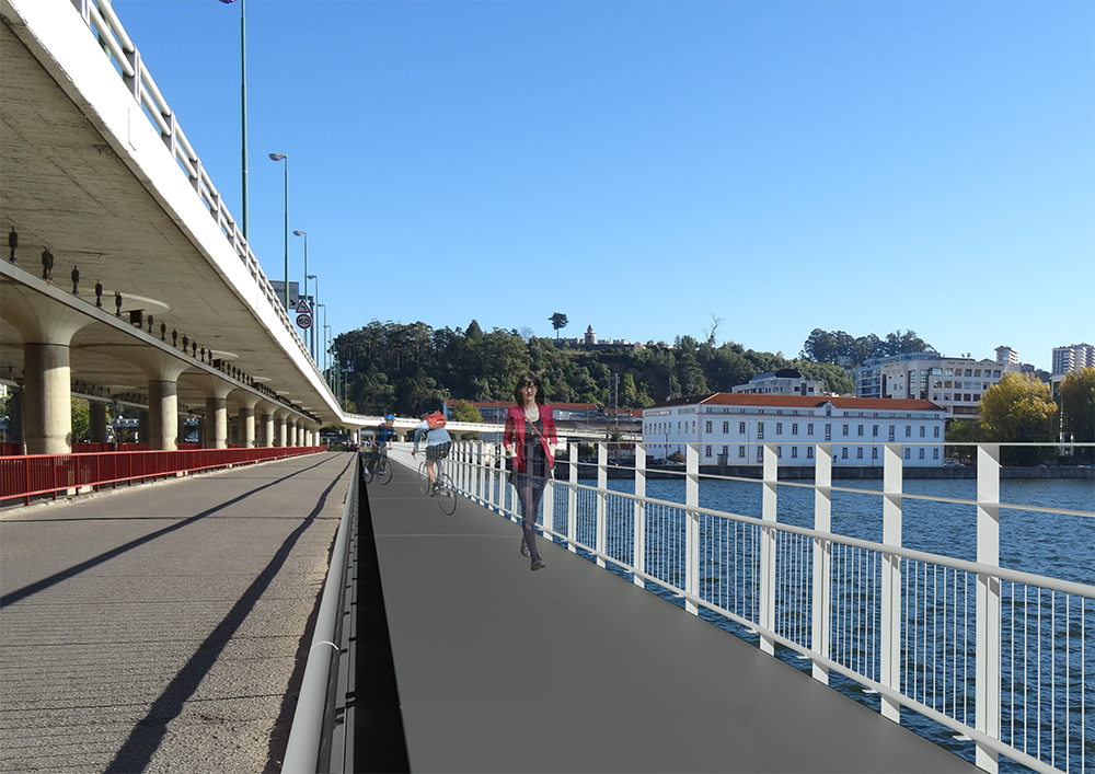 A solução construtiva a adotar passa pela colocação de uma estrutura em vigas metálicas contínuas em treliça, suportadas por estruturas em consola apoiadas nos contrafortes de betão existentes. O tabuleiro será em chapa de aço nervurada, de efeito antiderrapante. A guarda lateral terá uma altura de 1,20m a montante, para maior segurança de ciclistas e peões, sendo reutilizada, parcialmente, a guarda existente. Na separação entre os tabuleiros rodoviário e pedonal/ciclável será colocada uma guarda de segurança metálica tubular que impeça a invasão da zona pedonal por veículos automóveis.