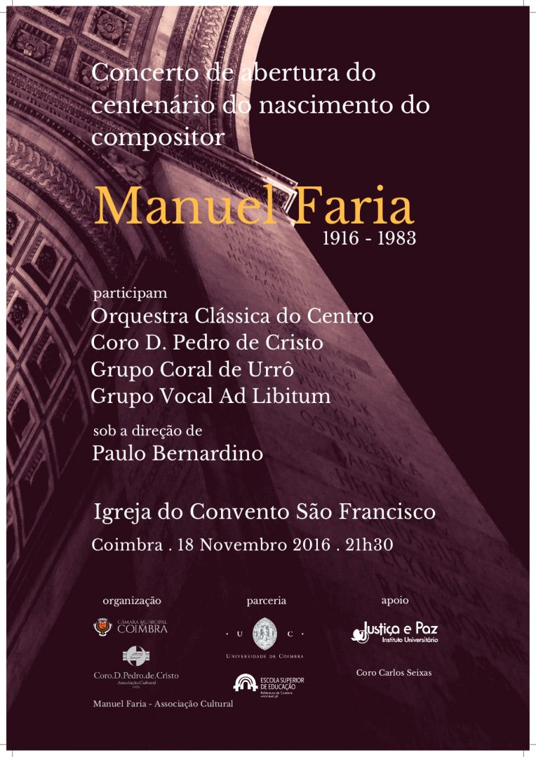 A Igreja do Convento São Francisco recebe, a 18 de novembro, pelas 21h30, o concerto de abertura do Centenário do nascimento de Manuel Faria. Paulo Bernardino, músico e maestro que está a desenvolver o seu trabalho de doutoramento sobre Manuel Faria, dirige neste concerto a Orquestra Clássica do Centro, o Coro D. Pedro de Cristo, o Grupo Coral de Urrô e o Grupo Vocal Ad Libitum. Mais de 150 pessoas em palco vão interpretar peças em estreia absoluta.