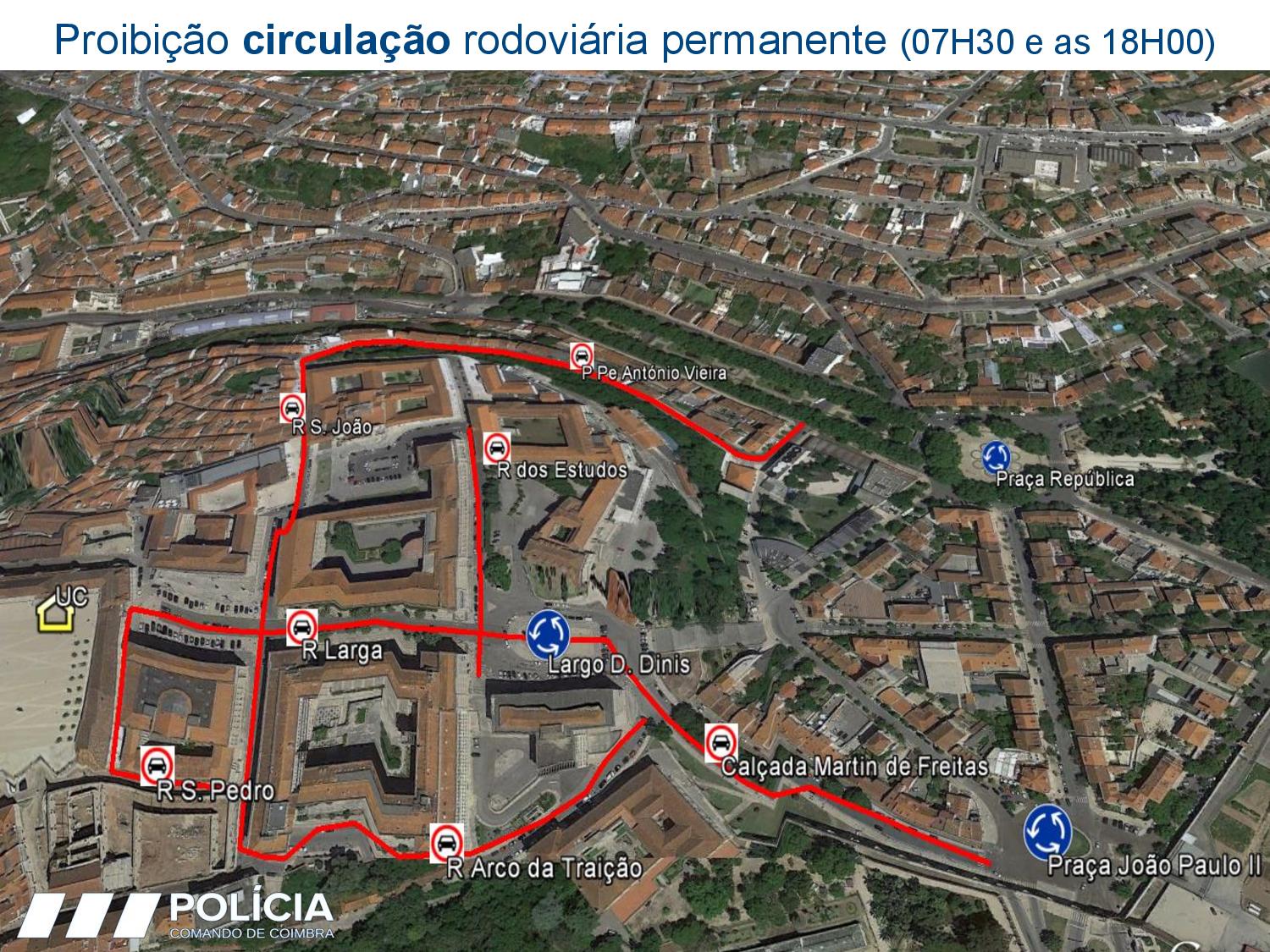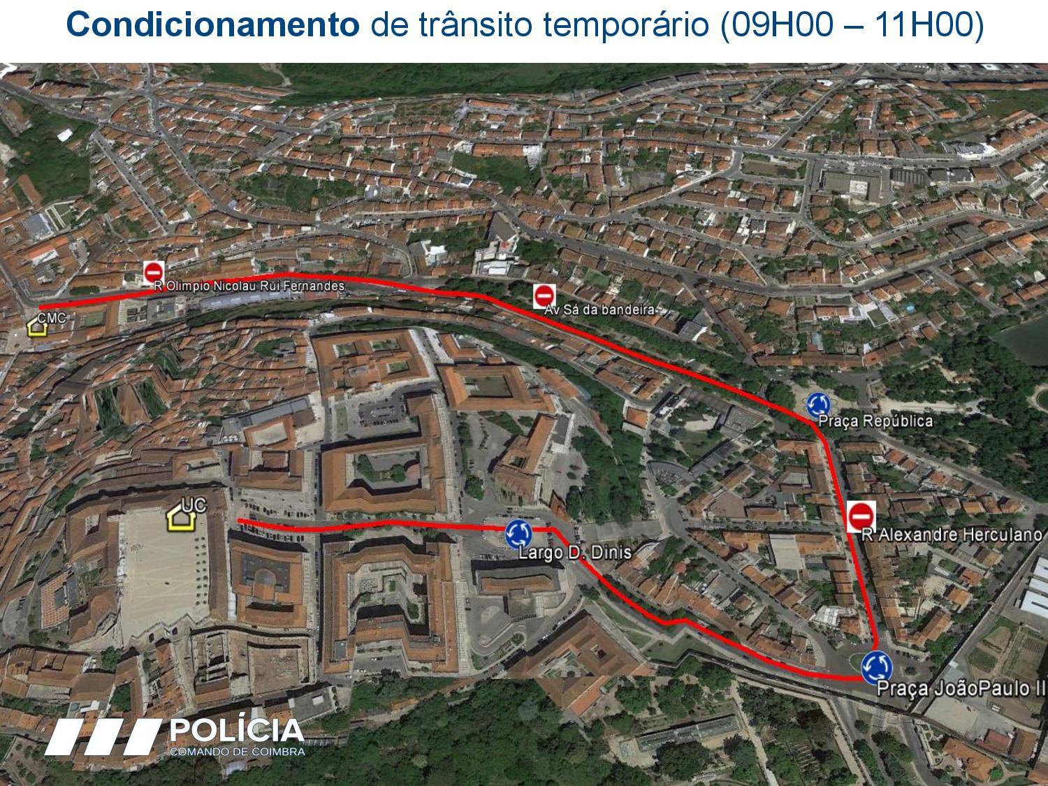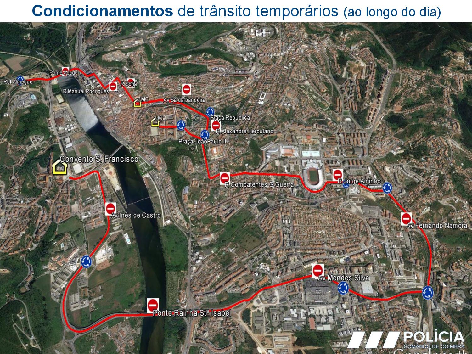 Rua OlÃmpio Nicolau Rui Fernandes, Av. Sá da Bandeira, Praça da República, Rua Alexandre Herculano, Praça João Paulo II, Calçada Martim de Freitas, Largo D. Dinis, Rua Larga e Porta Férrea. Assim que a comitiva passar, será resposta a circulação rodoviária.Â