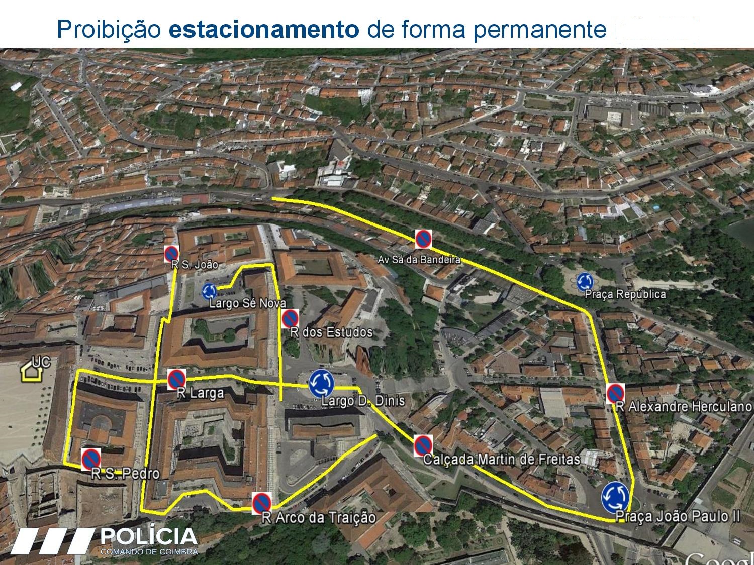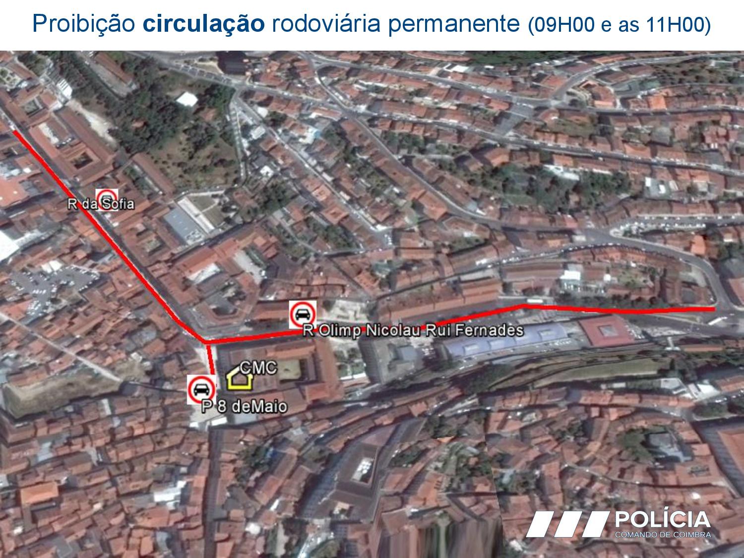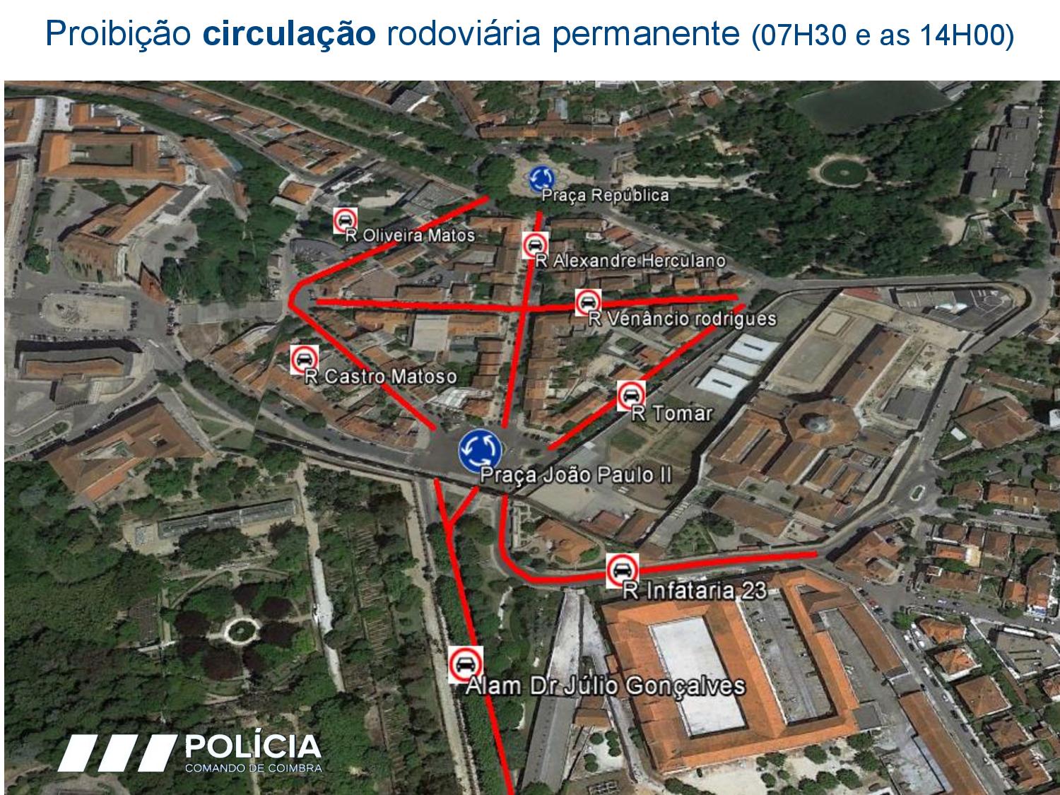Rua OlÃmpio Nicolau Rui Fernandes, Av. Sá da Bandeira, Praça da República, Rua Alexandre Herculano, Praça João Paulo II, Calçada Martim de Freitas, Largo D. Dinis, Rua Larga e Porta Férrea. Assim que a comitiva passar, será resposta a circulação rodoviária.Â