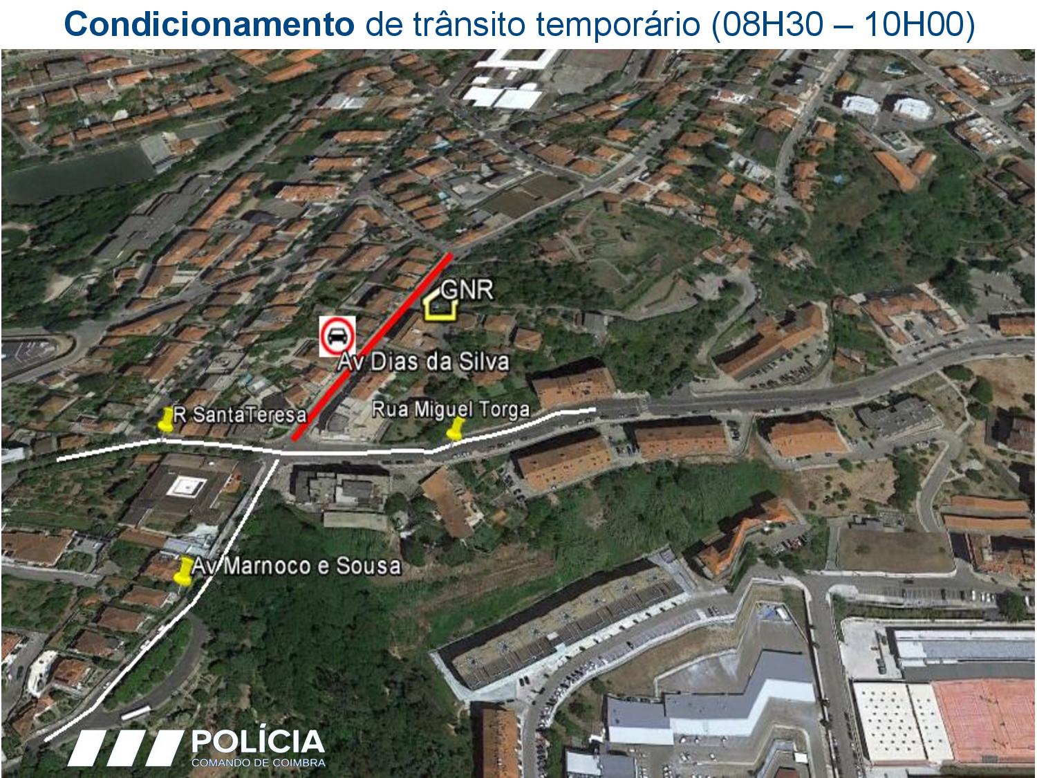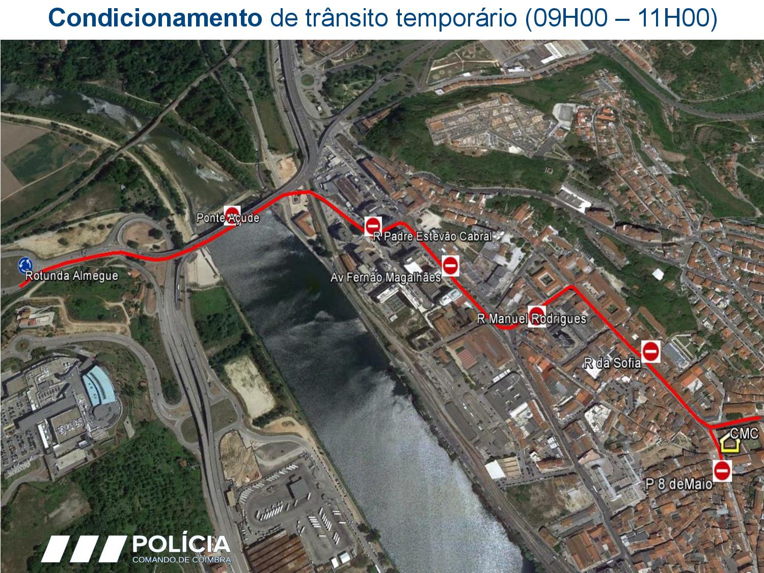 N 341 (sentido Taveiro – Coimbra), da saÃda da A1 à Rotunda do Almegue, Ponte Açude, Rua Padre Estevão Cabral, Av. Fernão de Magalhães, Rua Doutor Manuel Rodrigues, Rua da Sofia e Praça 8 de Maio. Assim que a comitiva passar, será resposta a circulação rodoviária.Â