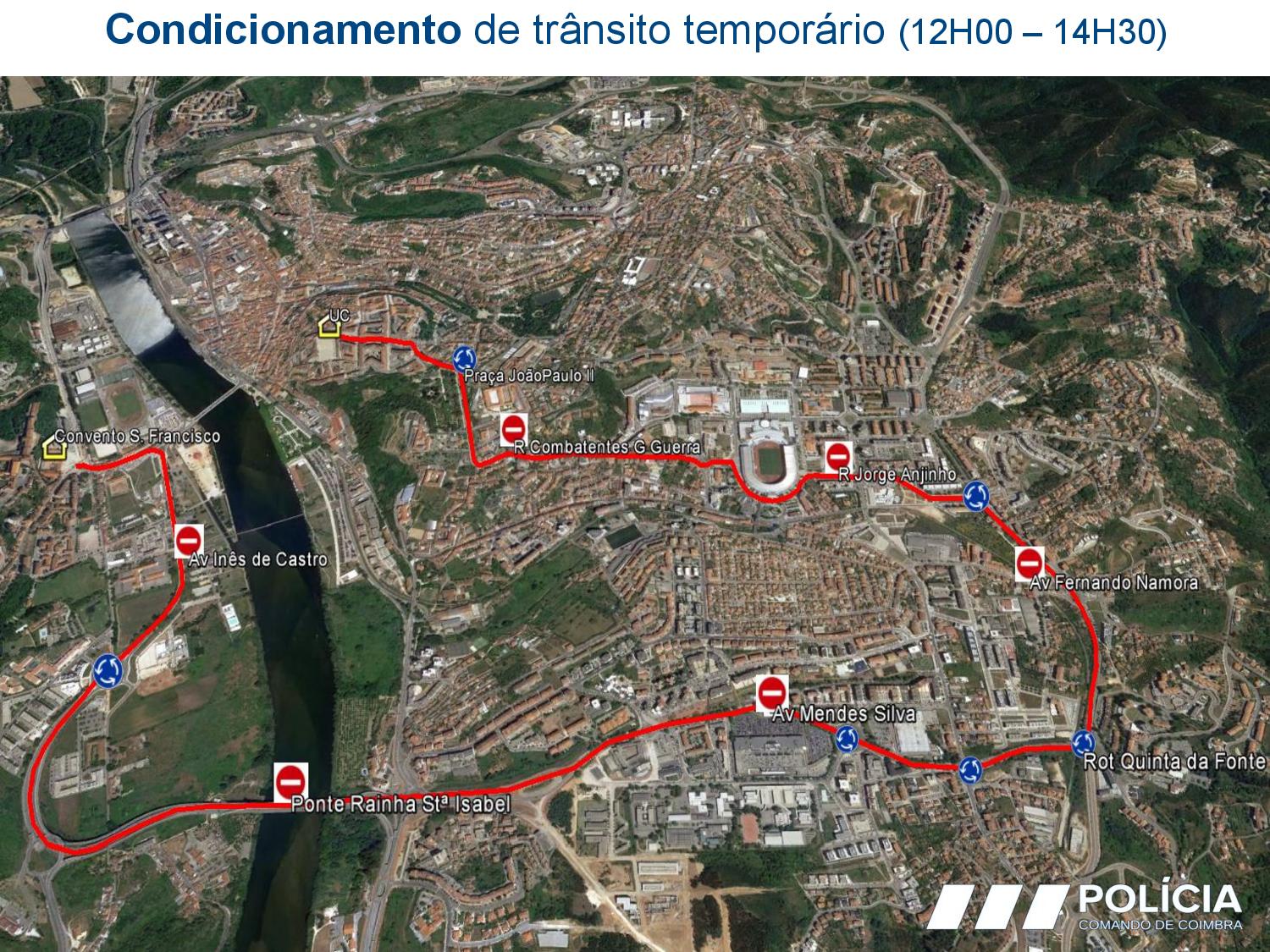 Porta Férrea, Rua Larga, Largo D. Dinis, Calçada Martim de Freitas, Praça João Paulo II, Alameda Dr. Júlio Henriques, Rua Combatentes da Grande Guerra, Praça São José, Rua do Estádio, Rua Dom Manuel I, Rua Dom João III, Rua Jorge Anjinho, Av. Fernando Namora, Av. Mendes Silva, Ponte Rainha Santa Isabel, Av. Inês de Castro, Av. João das Regras e Convento São Francisco. Assim que a comitiva passar, será resposta a circulação rodoviária.Â