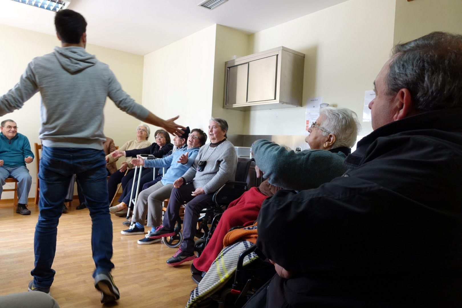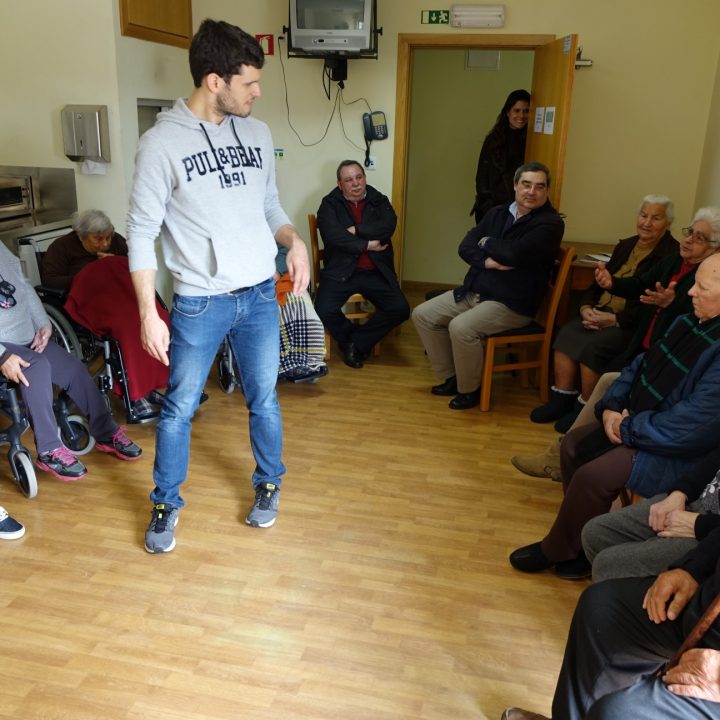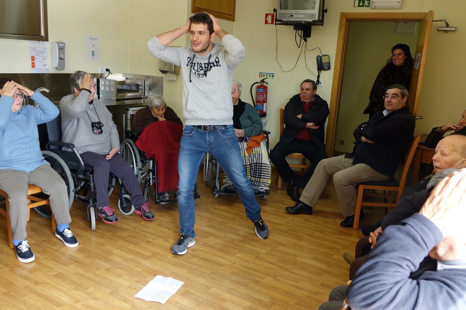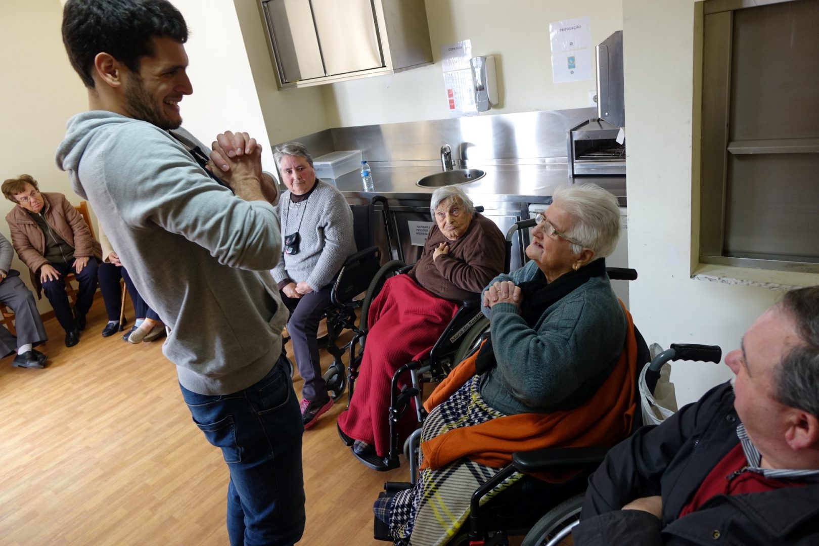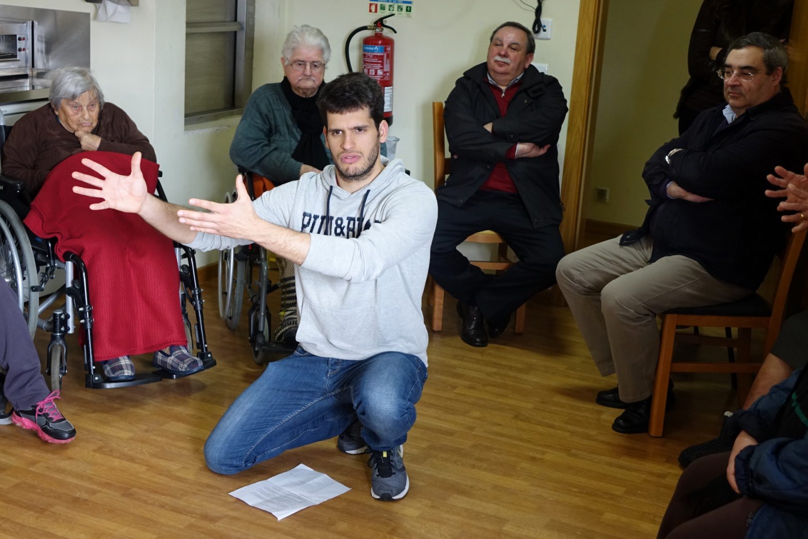 “Quando pensamos em amor, pensamos em quê?” Esta foi a primeira pergunta que João Santos fez ao grupo, pedindo a cada um dos participantes para lhe responder e encontrar um gesto que simbolizasse a sua resposta. Os 18 idosos falaram dos pais, dos filhos, dos netos e dos bisnetos, das mulheres e dos maridos, e de amores perdidos, e fizeram gestos como embalar, abraçar, beijar para descrever o que iam sentindo.