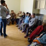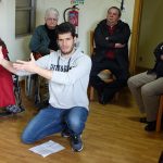 A segunda parte da sessão foi sobre uma carta. Uma carta escrita “a meias” na aula passada, assinada por um Joaquim para uma Dália, duas personagens fictícias inventadas pelos participantes. Uma carta de amor, que Joaquim escreve para a sua amada Dália, a propor que fujam para França para poderem ficar juntos, já que os pais de Dália não aprovam o namoro. E o desafio da aula de hoje era contar a carta por gestos, parágrafo a parágrafo, fazendo assim com que todos participassem e criassem um gesto para o seu parágrafo. Uma espécie de coreografia, que será depois apresentada no final, num teatro que contará com os idosos como protagonistas.