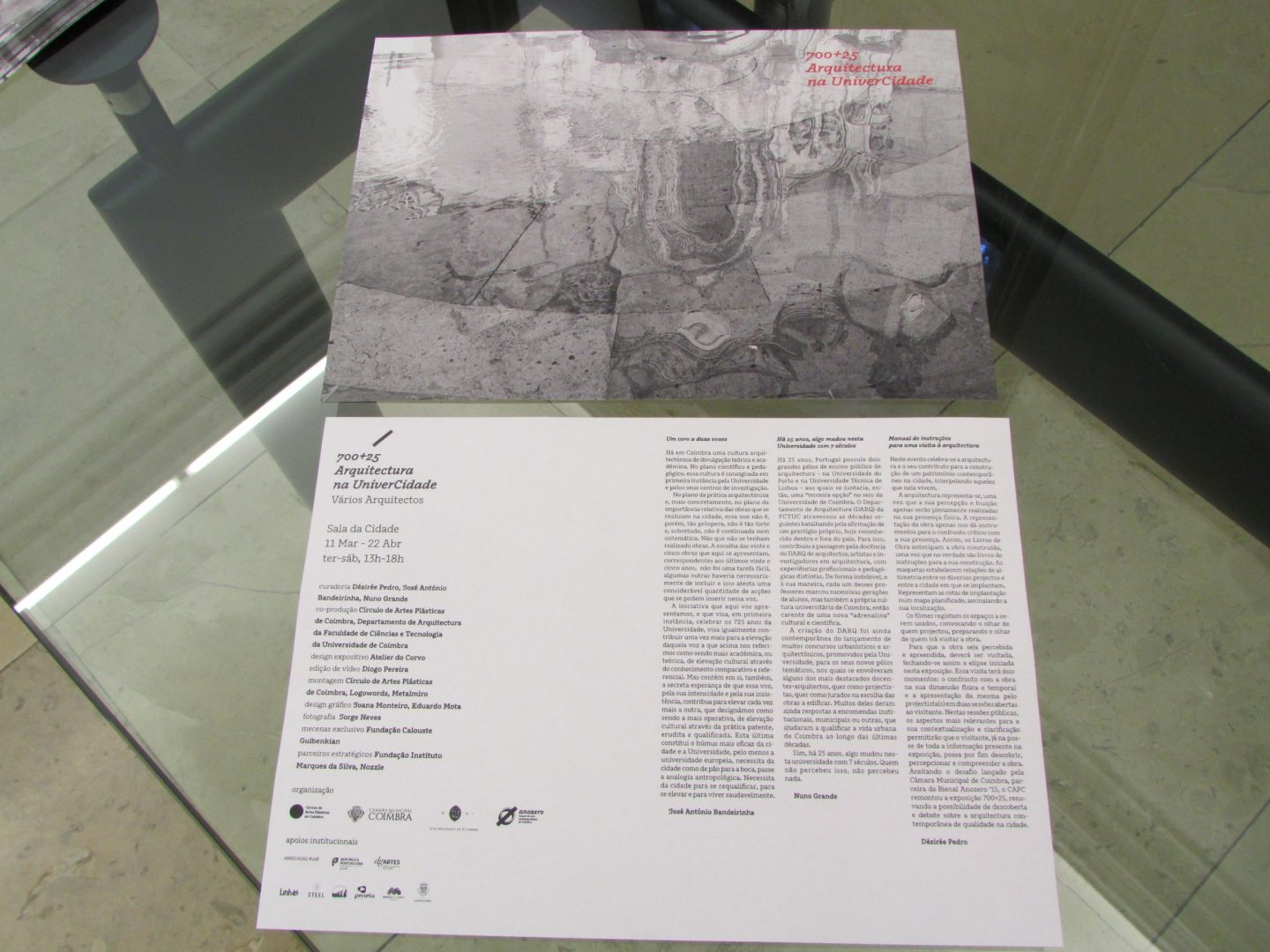 A exposição “700 + 25 Arquitectura na UniverCidade” tem curadoria de Nuno Grande, José António Bandeirinha e Desirée Pedro, que marcaram presença na (re)inauguração, assim como Carina Gomes, vereadora da Cultura da Câmara Municipal de Coimbra (CMC). A mostra integrou a primeira bienal Anozero, em 2015, organizada pelo Circulo de Artes Plásticas de Coimbra, Câmara Municipal de Coimbra e Universidade de Coimbra.