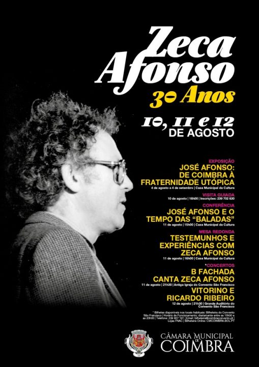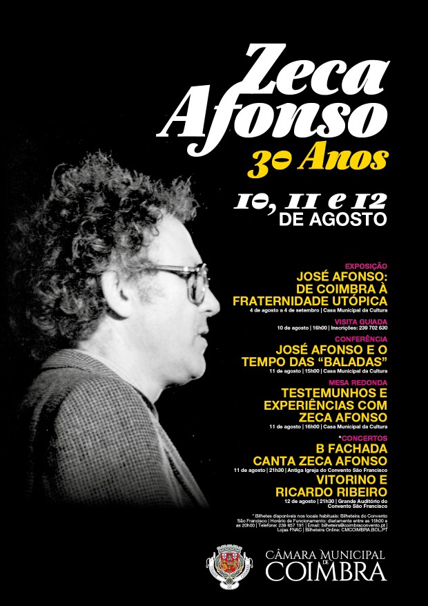 A Câmara Municipal de Coimbra presta homenagem a Zeca Afonso, através de um programa cultural, nos próximos dias 10, 11 e 12 de agosto, em diversos espaços da cidade, com destaque para o Convento São Francisco e para a Casa Municipal da Cultura. Uma exposição, uma conferência, uma mesa redonda, uma visita guiada e, naturalmente, música, fazem parte deste tributo, no ano em que se assinalam 30 anos da morte de José Afonso (Setúbal, 23 de fevereiro de 1987), nome maior da cultura portuguesa, cujo género musical de que foi um dos mais fortes cultores e impulsionadores alcançou dimensão universal.
