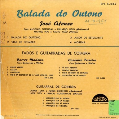 As primeiras canções de José Afonso, em cuja emotividade poética, originalidade melódica e singularidade rítmica se cruzam com inquietação social, surrealismo popular, lirismo amoroso e utopismo libertário, tiveram impacto não apenas no renovamento do canto académico de Coimbra, mas no processo mais amplo de regeneração da “Música Popular Portuguesa”.