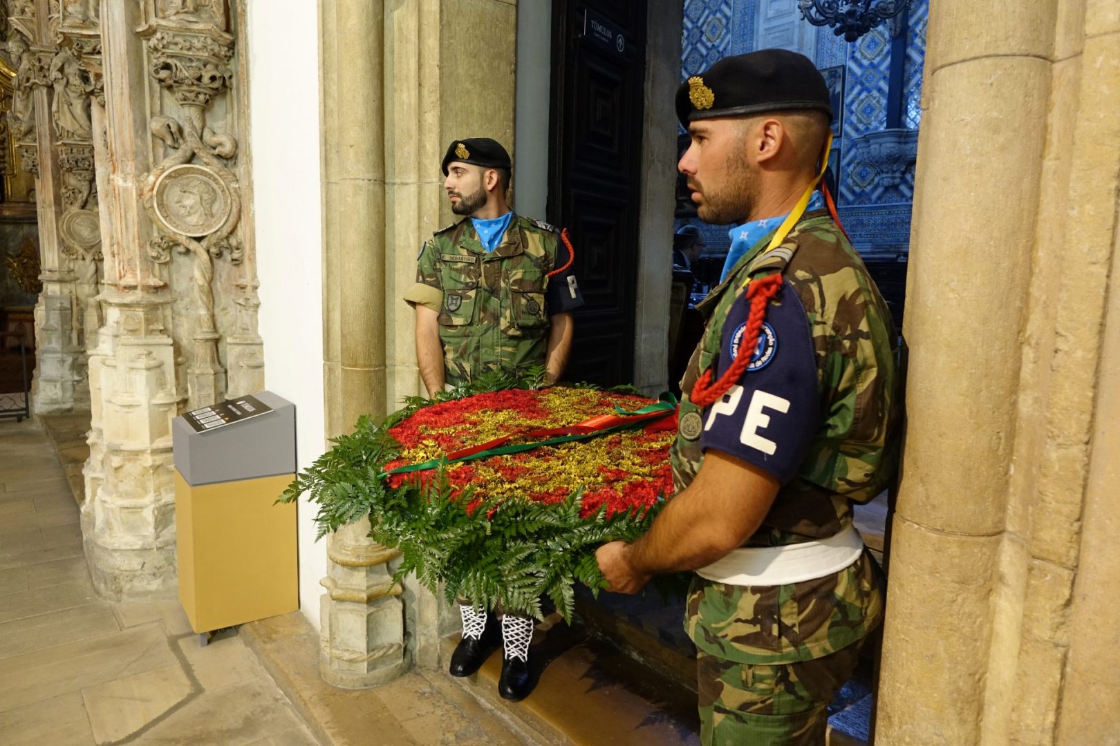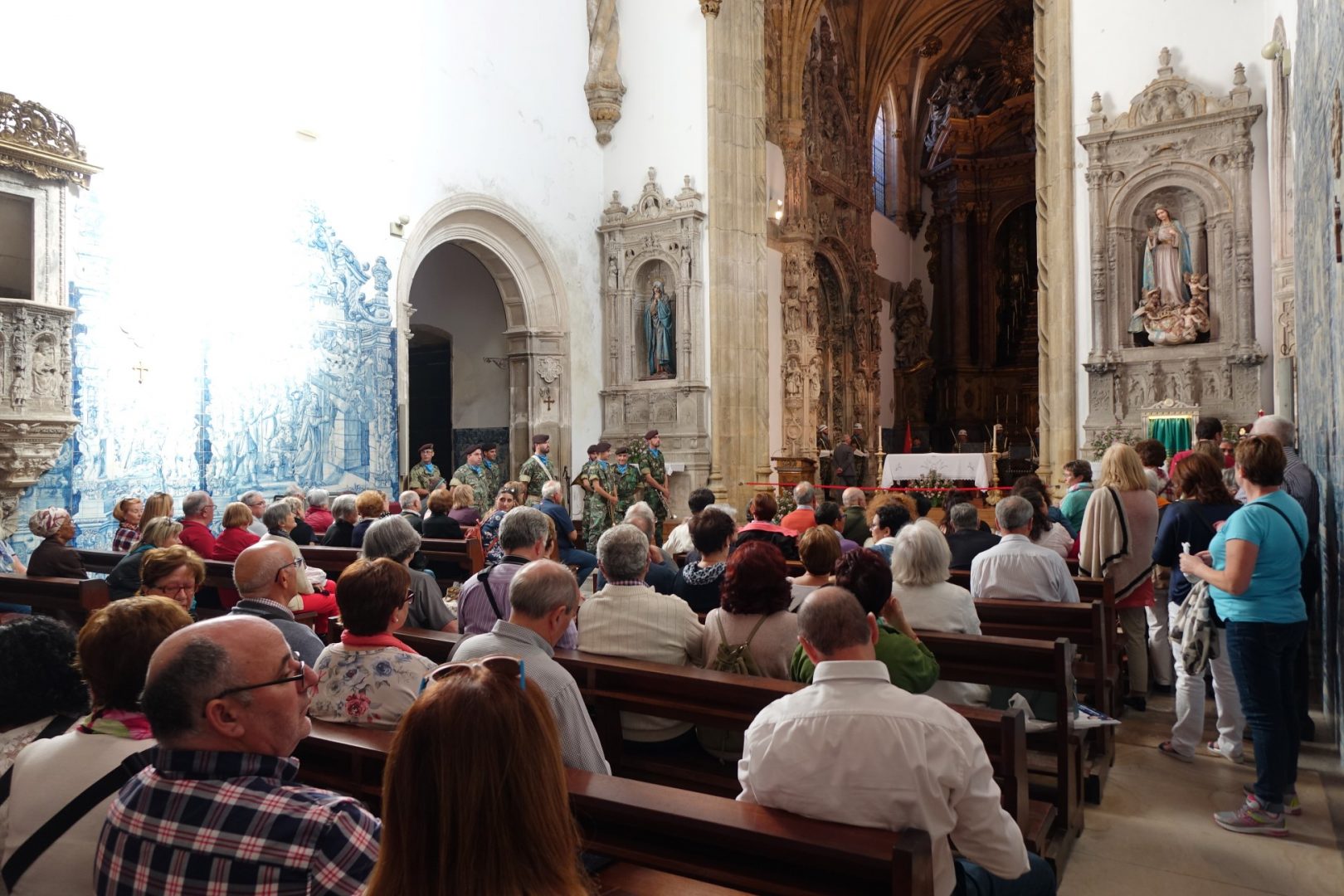 A comitiva deslocou-se depois para a Igreja de Santa Cruz, onde se cumpriu o ritual que evoca e homenageia D. Afonso Henriques, através da colocação de uma espada e da deposição de uma coroa de flores no seu túmulo.