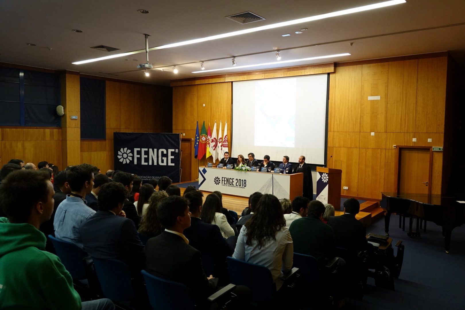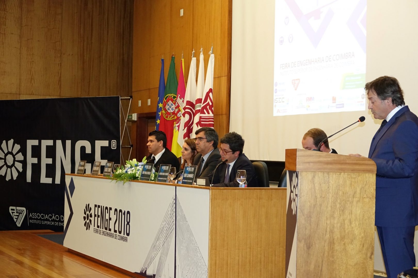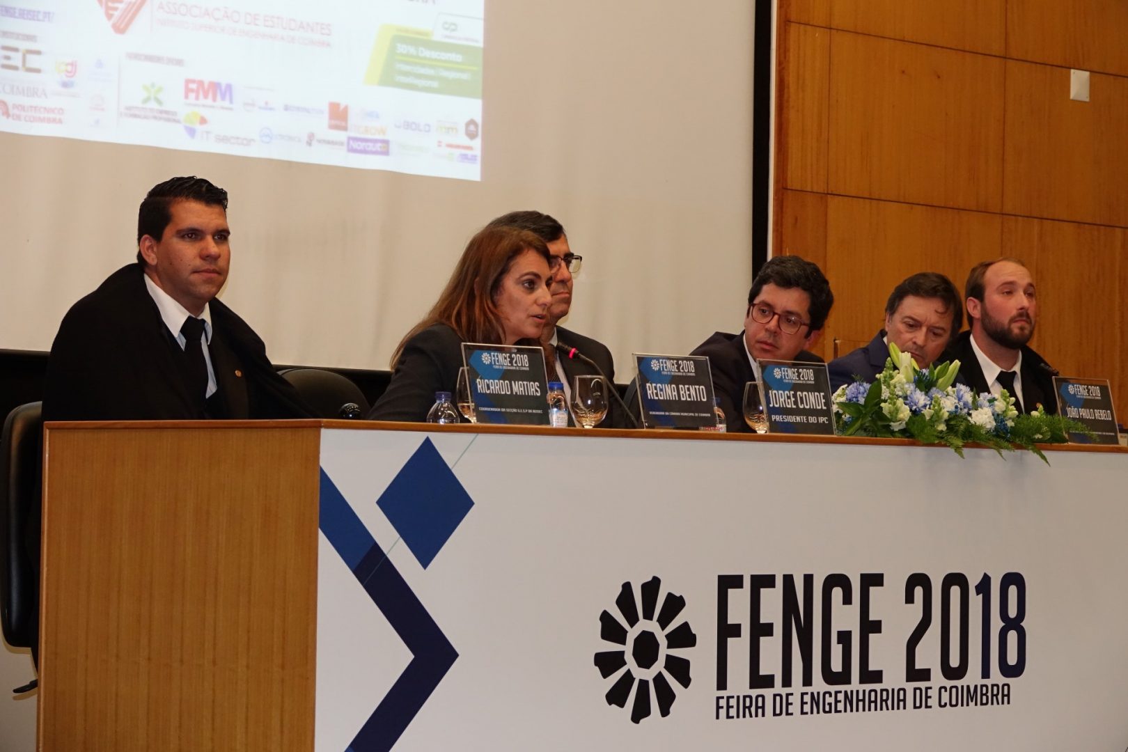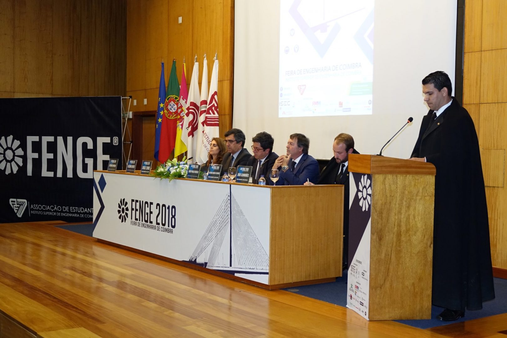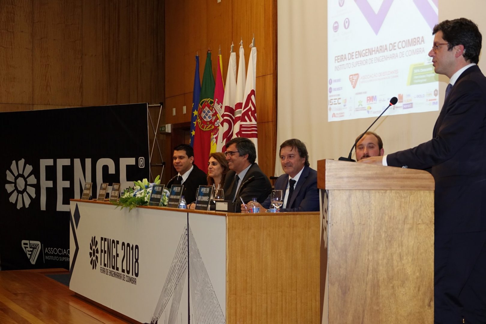 A sessão de abertura contou ainda com a presença do presidente do Instituto Politécnico de Coimbra (IPC), Jorge Conde, do presidente do ISEC, Mário Velindro, do presidente da AE ISEC, João Guimarães, e do coordenador do pelouro GESP da AE ISEC, Ricardo Matias. No final realizou-se a inauguração da FENGE no campus da ISEC, onde os presentes visitaram todos os expositores.