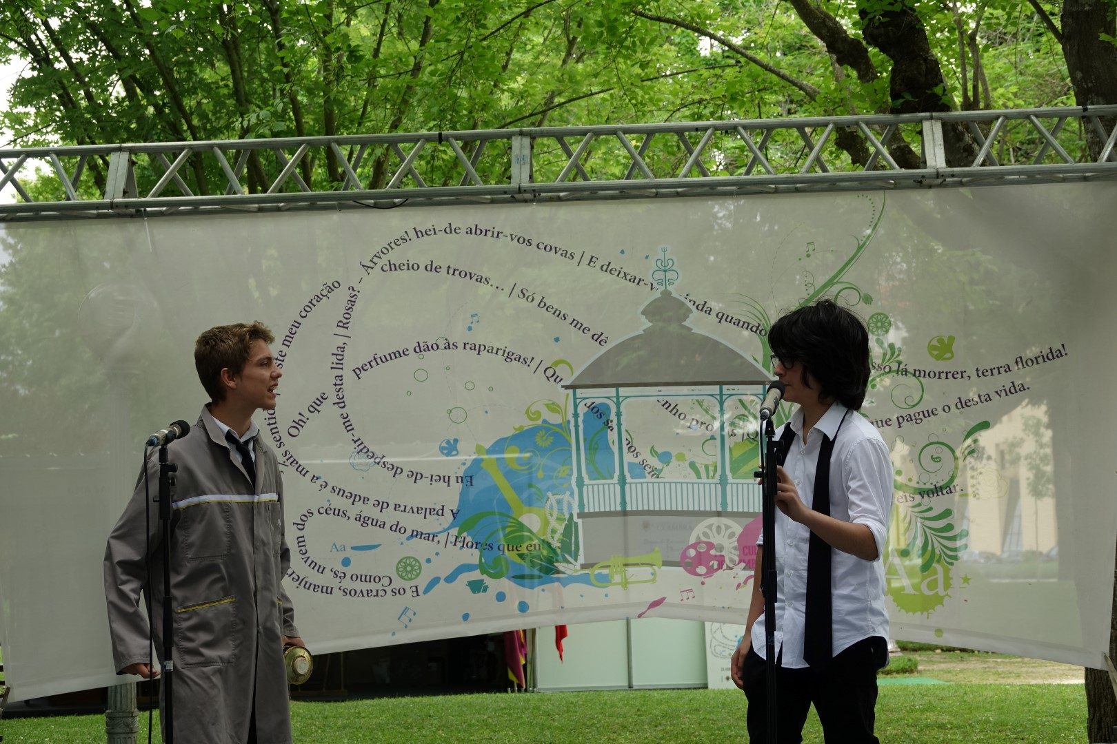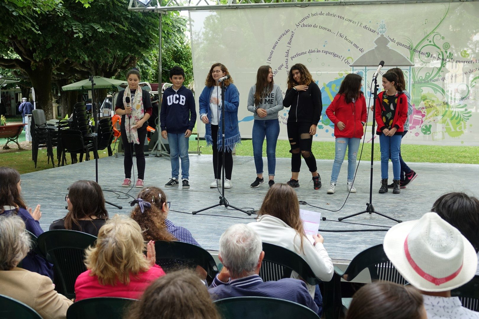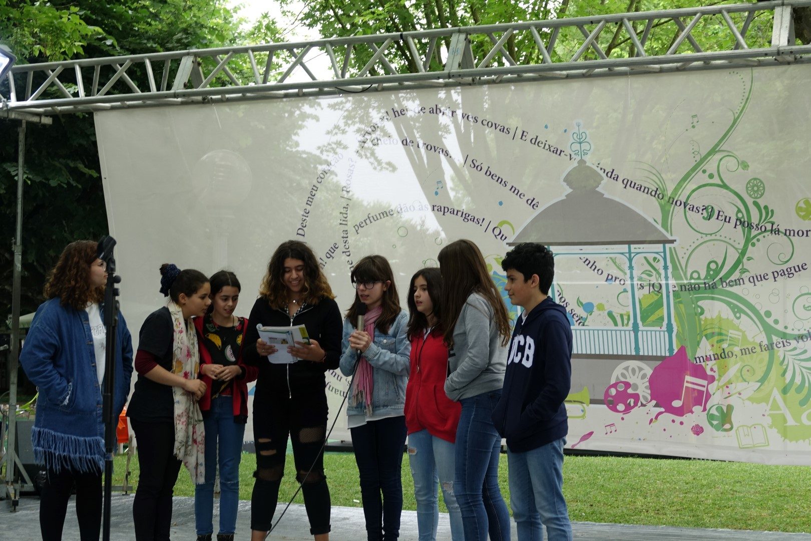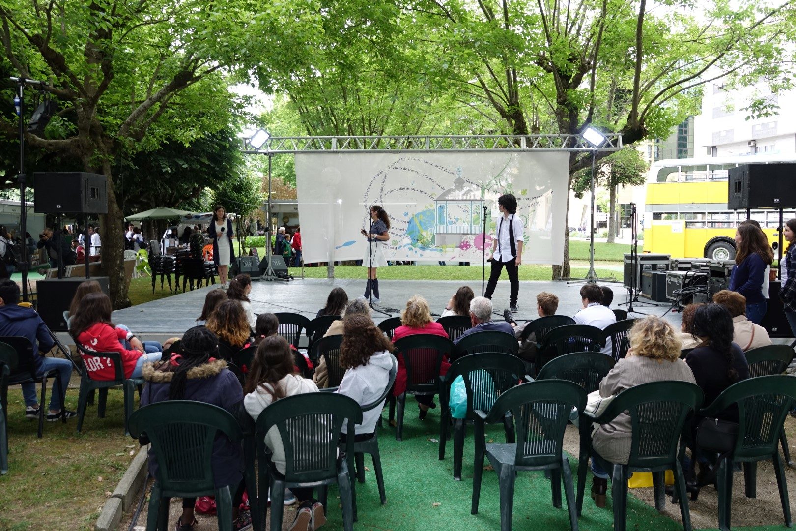 Já o Palco dos Livros recebeu representações de excertos poéticos e teatrais pelos alunos do 8º ano da Oficina de Teatro e do 9º ano de Educação Visual do Agrupamento de Escolas Eugénio de Castro. A tarde contou ainda com um concerto pelo grupo Laudo.