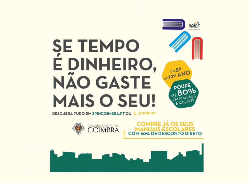 Todos os munícipes podem comprar os manuais com 60% desconto (40% do PVP) em spinCoimbra.pt até ao final de setembro. Na compra são aceites também os vouchers MEGA, plataforma de emissão de vouchers para aquisição de manuais, para os livros do 5º e 6º ano.