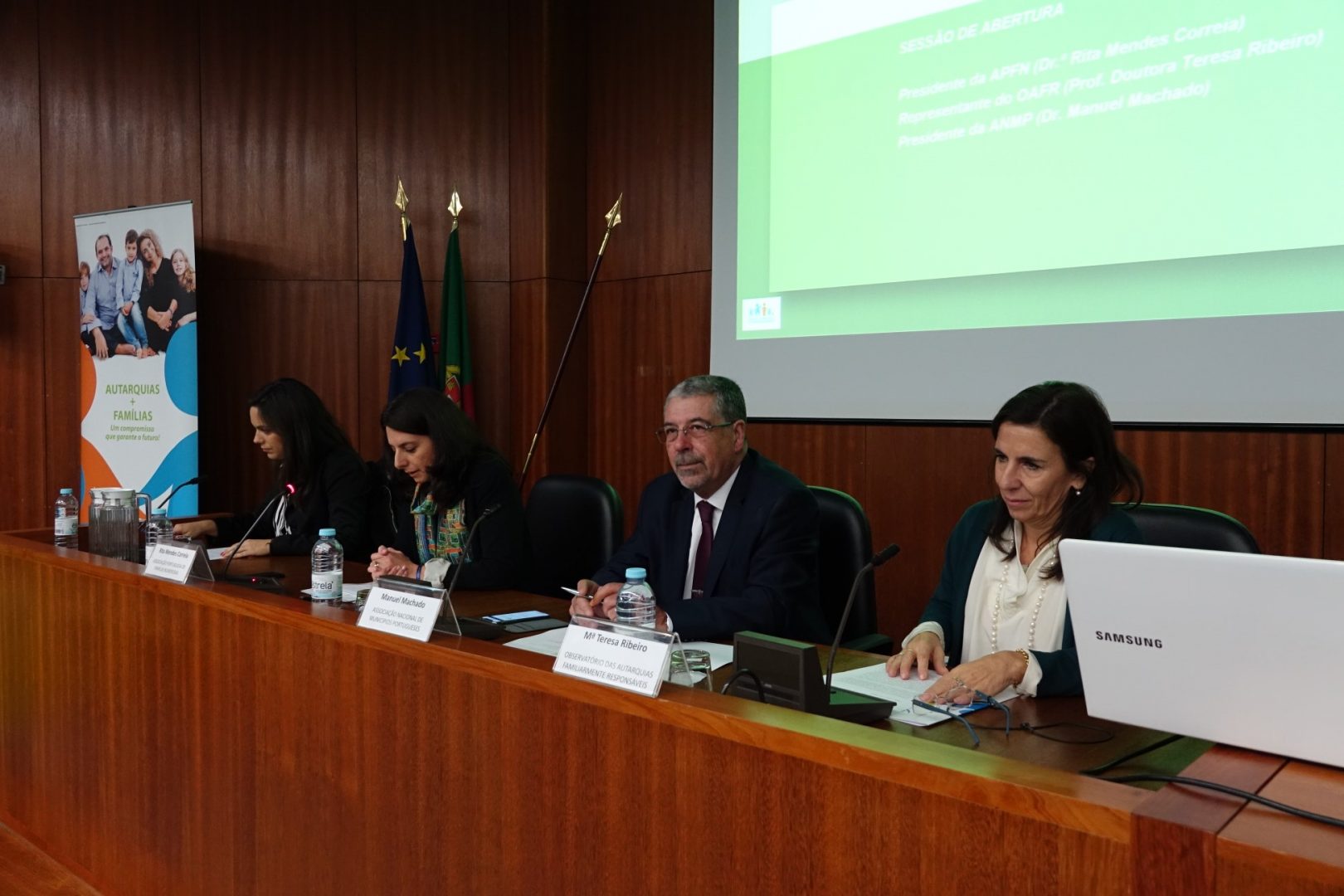 A sessão de abertura do encontro, para além de Manuel Machado, presidente da CM Coimbra e da ANMP, contou também com a representante do Observatório das Autarquias Familiarmente Responsáveis, Maria Teresa Ribeiro, e com a presidente da Associação Portuguesa de Famílias Numerosas, Rita Mendes Correia.