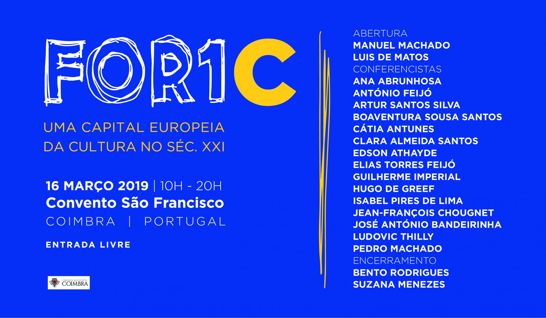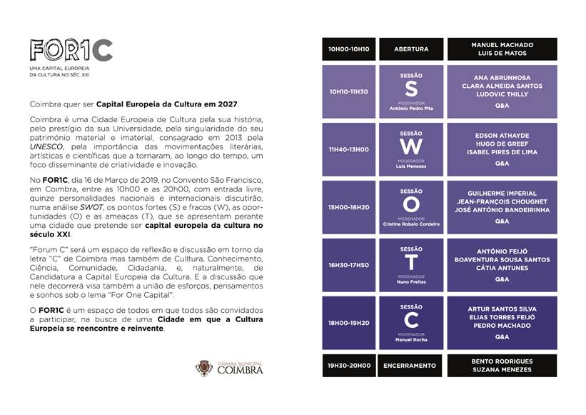 Coimbra é uma Cidade Europeia de Cultura pela sua história, pelo prestígio da sua Universidade, pela singularidade do seu património material e imaterial, consagrado em 2013 pela UNESCO, pela importância das movimentações literárias, artísticas e científicas que a tornaram, ao longo do tempo, um foco propagador de criatividade e inovação. O FOR1C celebra esse espírito e visão.