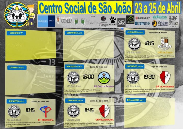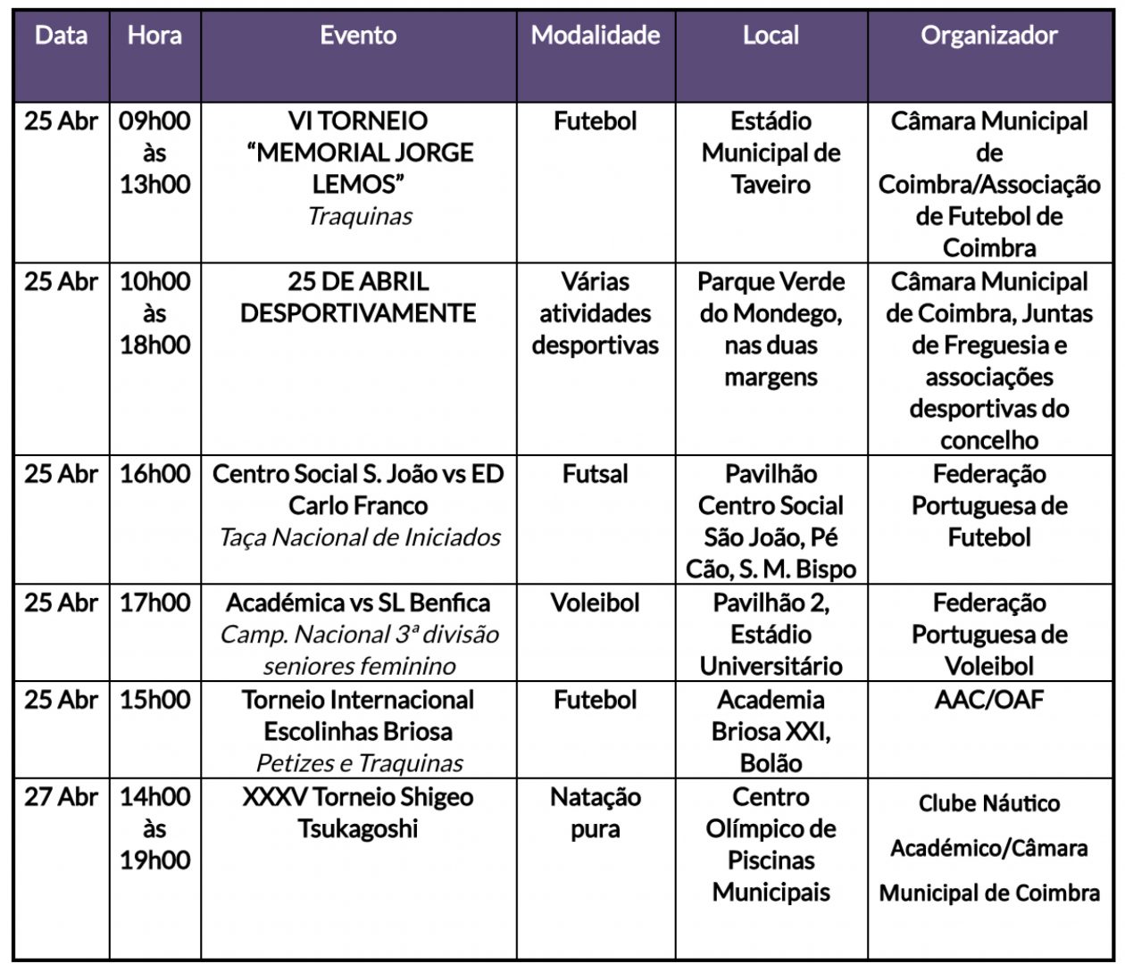 De manhã realiza-se ainda o VI Memorial Eng. Jorge Lemos, no Estádio Municipal de Taveiro. Um convívio organizado pela CM Coimbra, com a colaboração da Associação de Futebol de Coimbra, que pretende homenagear uma figura incontornável da cidade, o homem do desporto e autarca Jorge Lemos, e fomentar a prática desportiva junto dos mais jovens.