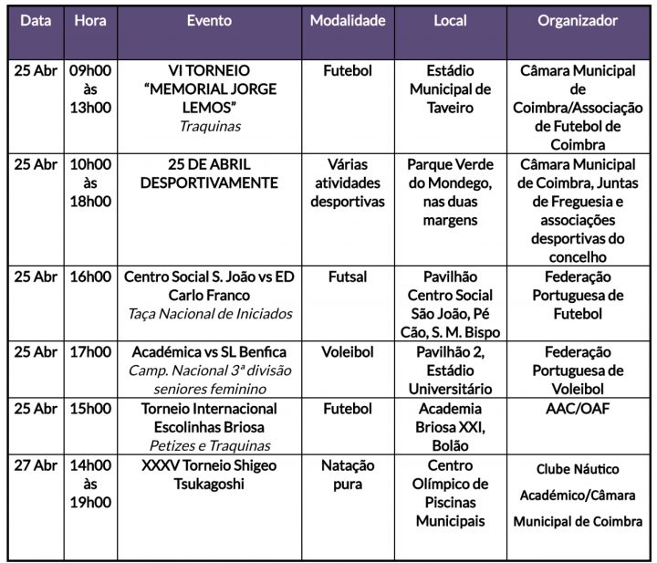 O programa do 25 de Abril Desportivamente é o seguinte: