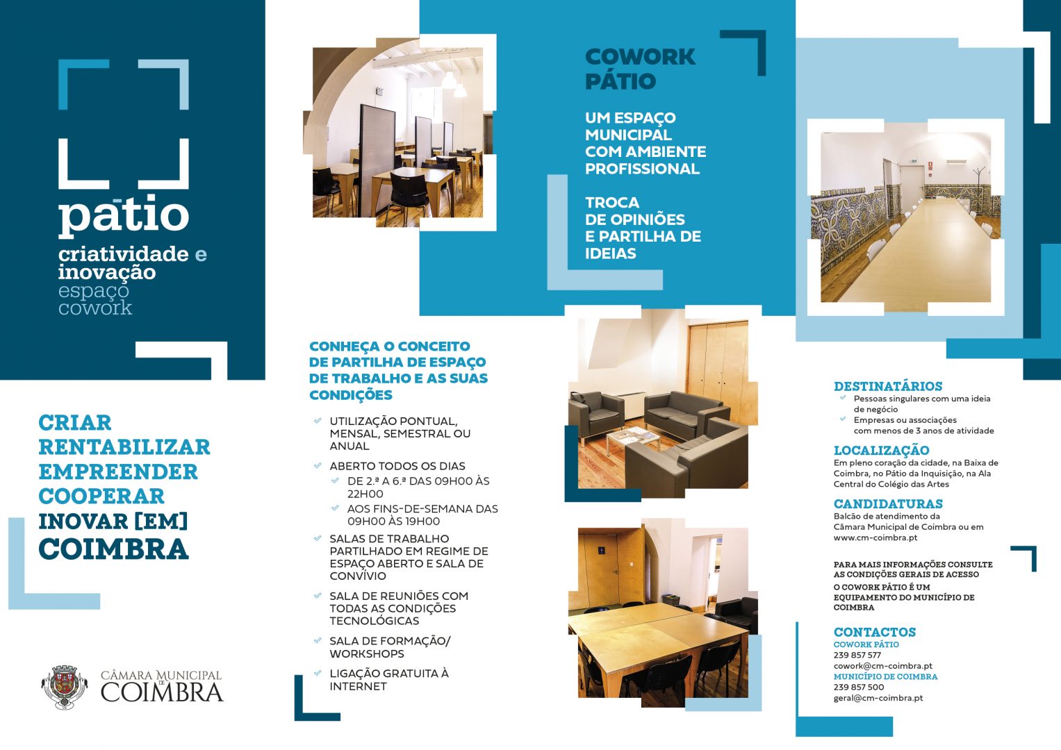 Reabilitado o edifício da Ala Central do Antigo Colégio das Artes, no Pátio da Inquisição, estão agora reunidas as condições para que o novo Espaço Municipal de Cowork comece a acolher os empreendedores interessados em desenvolver as suas ideias e em transformá-las em negócios. Isto, num espaço partilhado, no qual dispõem de um conjunto de recursos necessários ao funcionamento de uma empresa (energia elétrica, internet, mobiliário, equipamento, salas de reunião com material informático, serviços de apoio e receção) e onde podem trabalhar e trocar ideias entre si, criar sinergias e formar parcerias de negócio. Um projeto que se insere, também, na estratégia de regeneração urbana da cidade e de revitalização do seu centro histórico e que pretende tornar este espaço num polo dinamizador de indústrias criativas e de incentivo ao aparecimento de novas empresas e negócios.