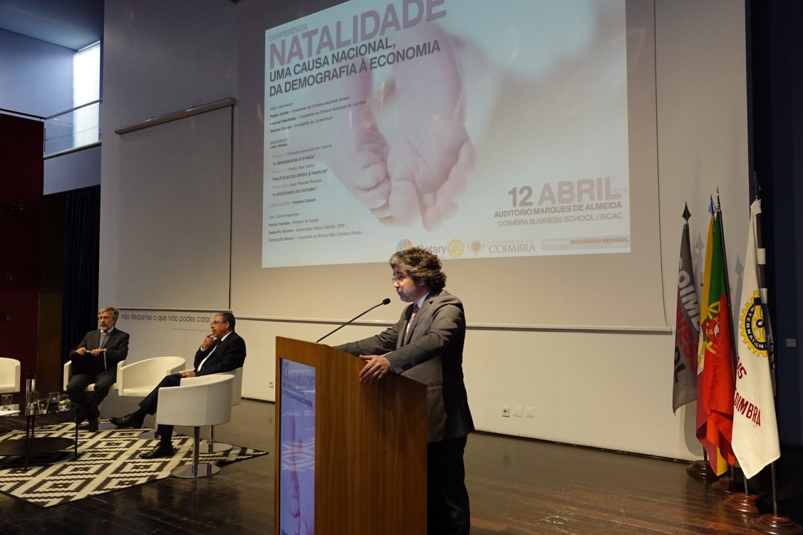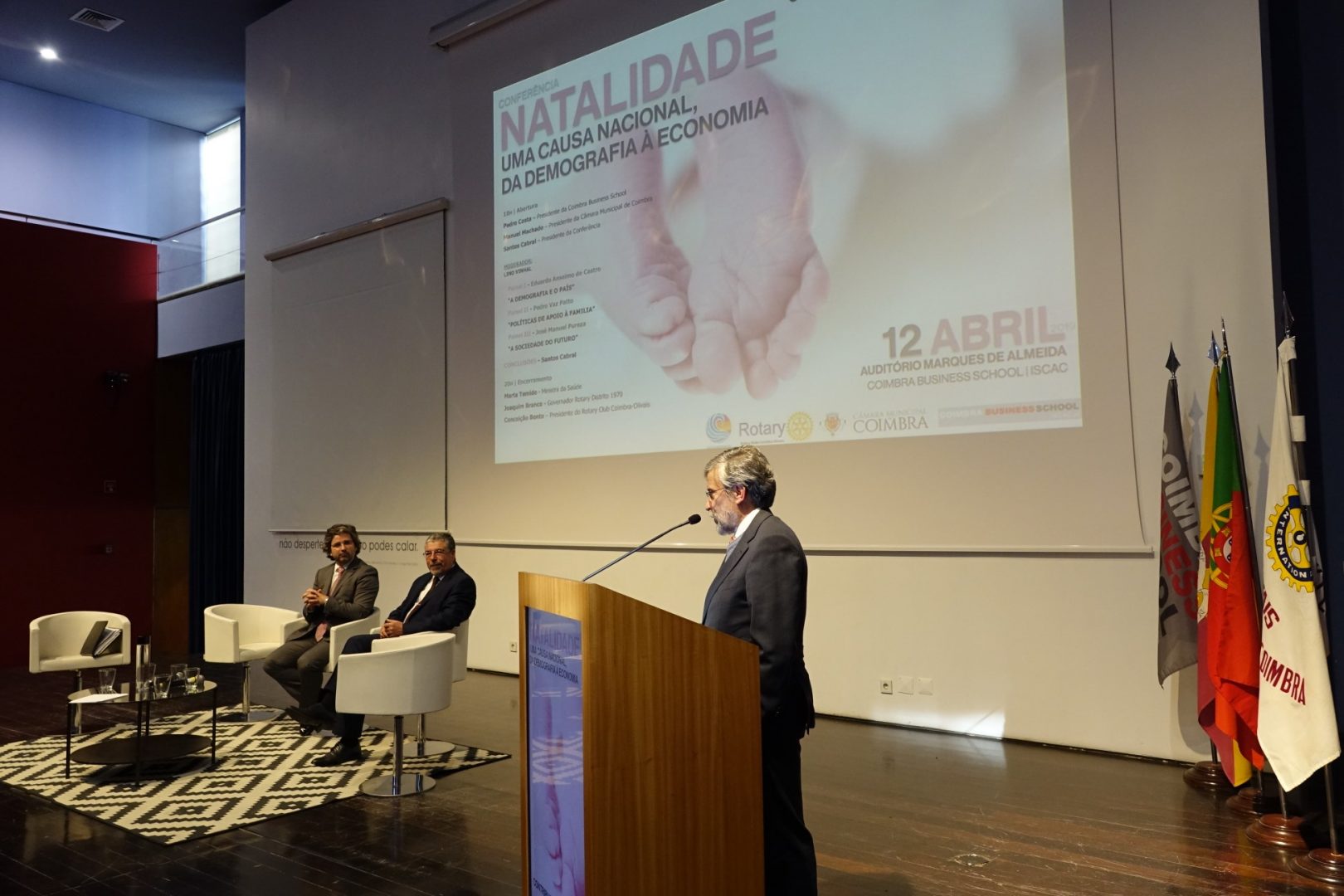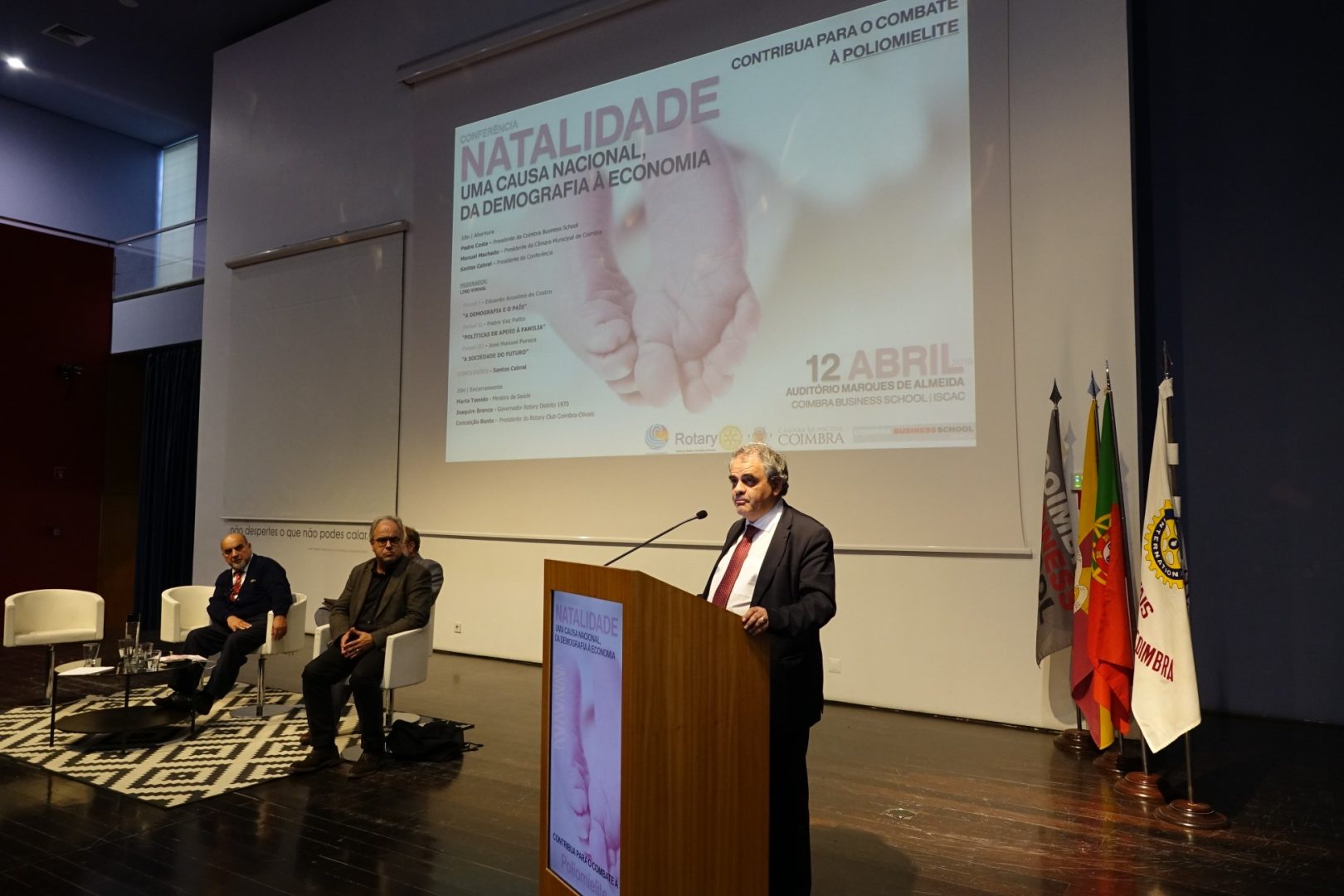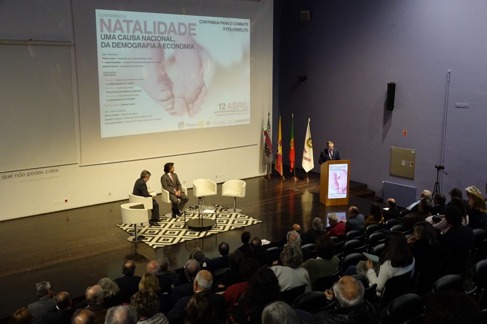 Inserida no movimento de combate à poliomielite, a conferência “Natalidade: uma causa nacional, da demografia à economia” discutiu, em três painéis distintos, “A demografia e o país”, as “Políticas de Apoio à família” e a “A sociedade do futuro”. A iniciativa contou também com a presença do presidente do ISCAC, Pedro Costa, do Juiz Conselheiro, que presidiu à conferência, Santos Cabral, da presidente do Rotary Club Coimbra-Olivais, Conceição Bento, e do governador do Rotary Club Distrito 1970, Joaquim Branco, entre outras personalidades.