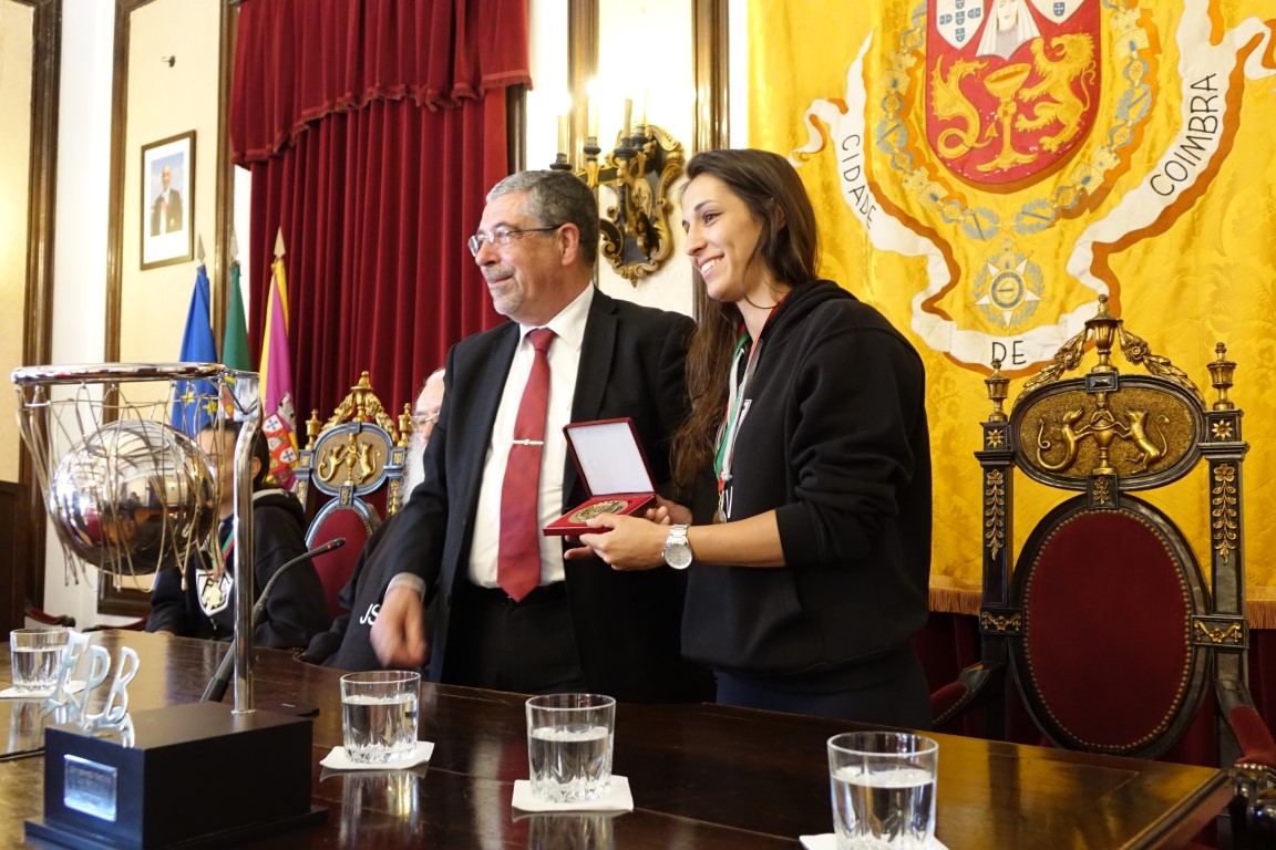 A equipa feminina de Basquetebol do Olivais Futebol Clube, que se sagrou campeã nacional no passado dia 4 de maio – e fez também a dobradinha, depois deste ano já ter vencido a Taça de Portugal – foi ontem recebida, pelo presidente da Câmara Municipal (CM) de Coimbra, Manuel Machado, no Salão Nobre dos Paços do Município. Manuel Machado elogiou o trabalho da equipa feminina, dos seus familiares, dos treinadores e dos dirigentes do clube, e entregou uma medalha de reconhecimento à capitã do Olivais Futebol Clube, Inês Viana, como forma da cidade homenagear as campeãs.