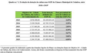 A CM Coimbra tem, ao longo dos últimos anos, reforçado significativamente a dotação para a Cultura e, em particular, a dotação destinada ao apoio ao associativismo cultural, no Orçamento e Grandes Opções do Plano (GOP), ao mesmo tempo que tem aumentado o número de projetos candidatos e o número de apoios concedidos. Por exemplo, em 2013 o peso percentual da área da Cultura no total das GOP era de 3,45% e em 2019 é já de 6%, o que resultou num reforço de dotação superior a 2,3 milhões de euros.