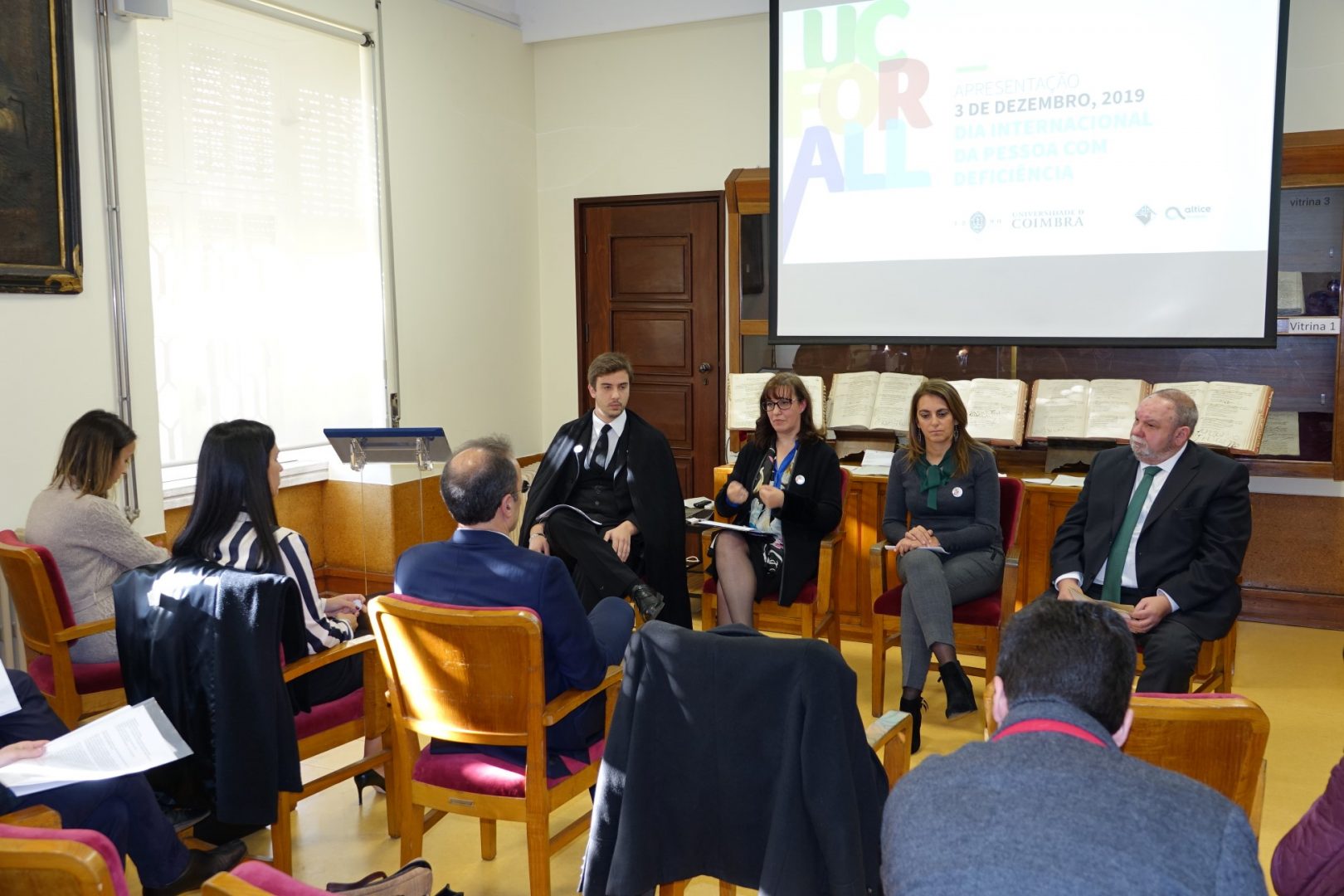 O programa foi apresentado pela vice-reitora da UC para os Assuntos Académicos e Serviços da Ação Social. Cristina Albuquerque explicou que a UC sempre se preocupou com esta matéria, mas que agora, com o UC for All, pretende “intervir de uma forma mais profunda e integrada” com o objetivo de promover a igualdade de oportunidades e equidade não só no acesso à universidade, mas também no sucesso académico e na integração no mercado de trabalho. A vice-reitora recordou que, atualmente, a UC tem 98 estudantes com necessidades especiais, falou das quatro áreas de intervenção principais do programa (acessibilidade física, acessibilidade digital, promoção do sucesso académico e combate ao abandono escolar e empregabilidade), deu exemplos de algumas ações a levar a cabo e terminou convidando Regina Bento, Jorge Alves e Daniel Azenha para se juntarem a ela e intervirem.