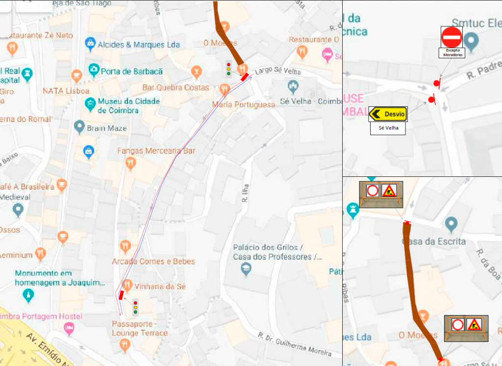 – O acesso ao Largo da Sé Velha será feito exclusivamente pelas ruas da Ilha e Joaquim António de Aguiar, que durante o período diurno (08h00 e as 18h00) terá circulação a decorrer nos dois sentidos, com recurso a semáforos, o que permitirá manter também a circulação da Linha (azul) do Centro Histórico até à Sé Velha e o acesso das viaturas à frente da obra (Rua dos Coutinhos). Durante o período noturno (18h00-08h00) a circulação faz-se como habitualmente.