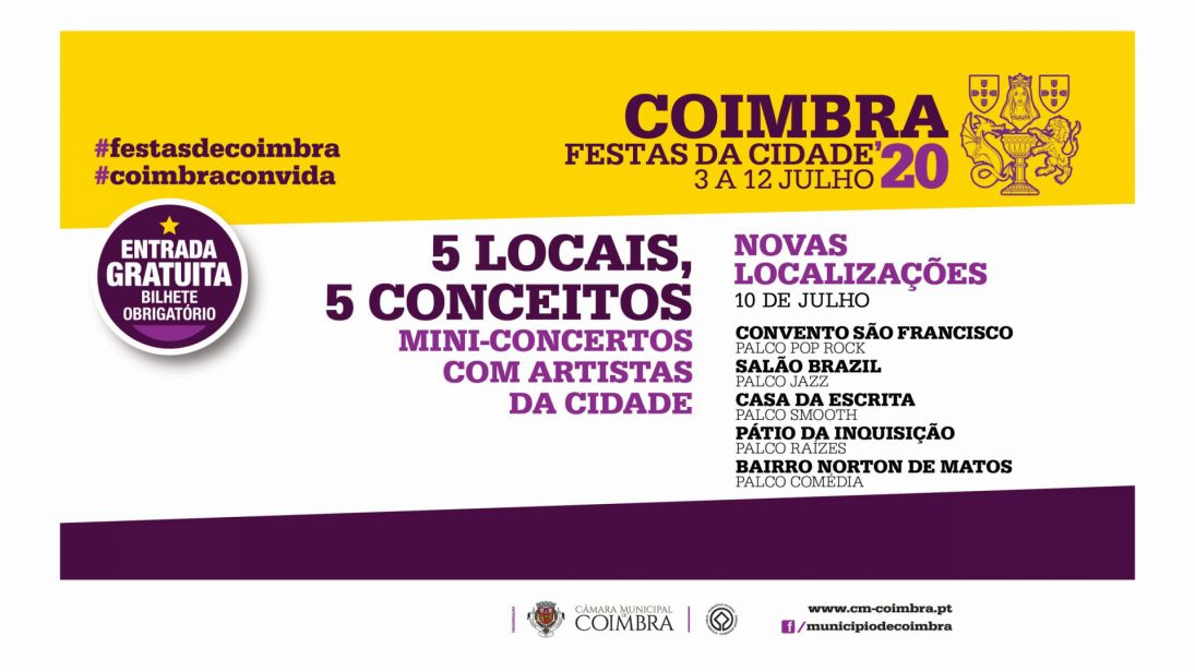 Estas iniciativas estavam previstas realizarem-se na Praça 8 de Maio, Terreiro da Erva, Largo Padre Estrela Ferraz (Igreja dos Olivais), Rua João de Deus Ramos (Gira Solum) e Praça Infante D. Henrique (Bairro Norton de Matos). No entanto, depois das sucessivas avaliações de segurança e da nova legislação publicada a 26 de junho, a CM Coimbra determinou novas localizações com caraterísticas que vão permitir o melhor cumprimento da limitação de aglomeração de pessoas em redor dos espaços dos espetáculos.