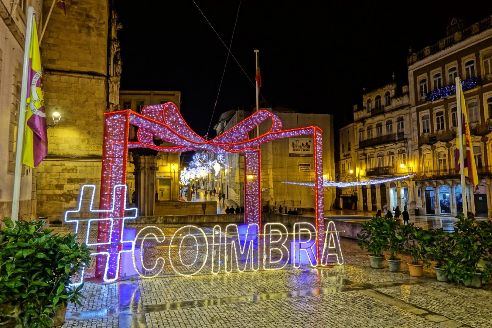 O edifício de CM Coimbra vai ficar com 19 cortinas de iluminação e mesmo em frente ao espaço vai estar uma árvore de Natal photo point com mais de sete metros de altura, para as habituais fotografias alusivas à época, acompanhada de uma estrutura com a marca #Coimbra. Aliás, não será o único local, também a zona da Portagem e a Praça das Cortes vão receber estruturas com a marca #Coimbra. Como habitualmente, várias árvores de Natal vão embelezar praças e largos da Baixa e várias rotundas vão estar enfeitadas com a mensagem luminosa de “Boas Festas”.