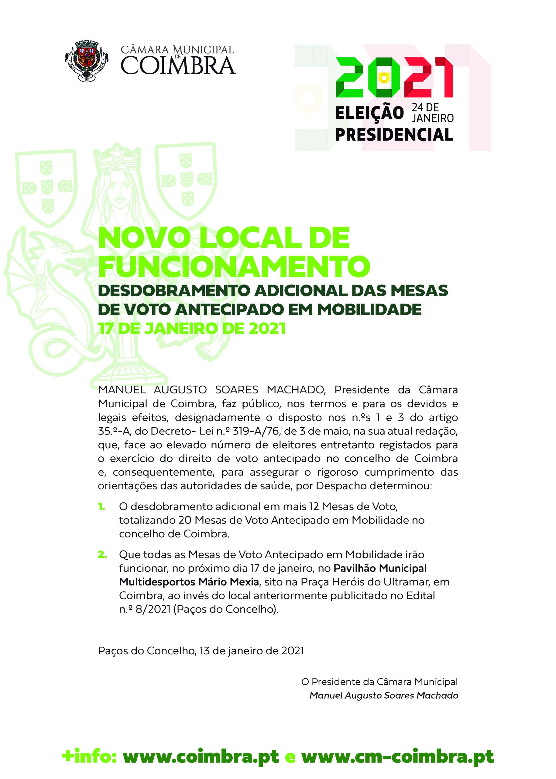 A Câmara Municipal (CM) de Coimbra informa que, face ao elevado número de eleitores entretanto registados para o exercício do direito de voto antecipado no concelho e por forma a garantir o rigoroso cumprimento das orientações das autoridades de saúde, as mesas de voto irão funcionar, no dia 17 de janeiro, no Pavilhão Municipal Multidesportos Mário Mexia e não nos Paços do Concelho, como foi inicialmente previsto. Informa-se, ainda, que haverá um desdobramento em mais 12 mesas de voto, totalizando, assim 20 mesas de voto antecipado em mobilidade no concelho de Coimbra.