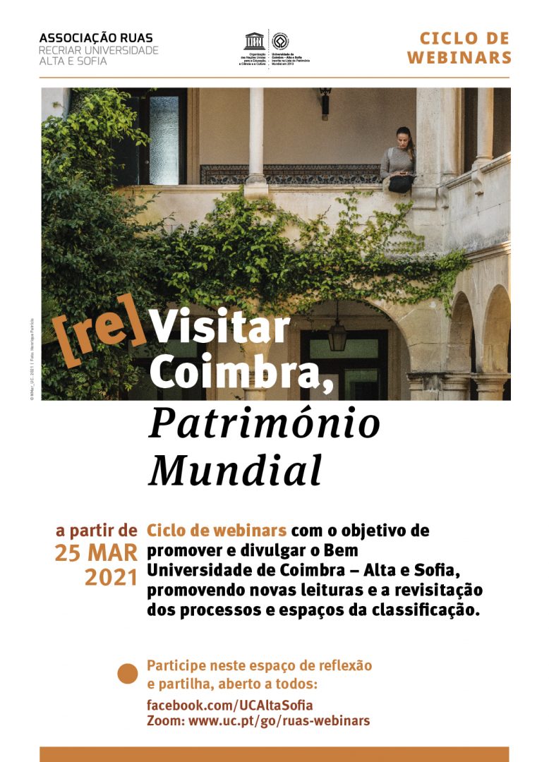 A Associação RUAS (Recriar Universidade Alta e Sofia) organiza, a partir da próxima quinta-feira, dia 25, o ciclo de webinars “[re]Visitar Coimbra, Património Mundial”. Com periocidade bimestral e de acesso gratuito, a iniciativa pretende promover e divulgar os espaços Universidade de Coimbra – Alta e Sofia inscritos na lista de Património Mundial, promovendo novas leituras e a revisitação dos processos e locais da classificação.