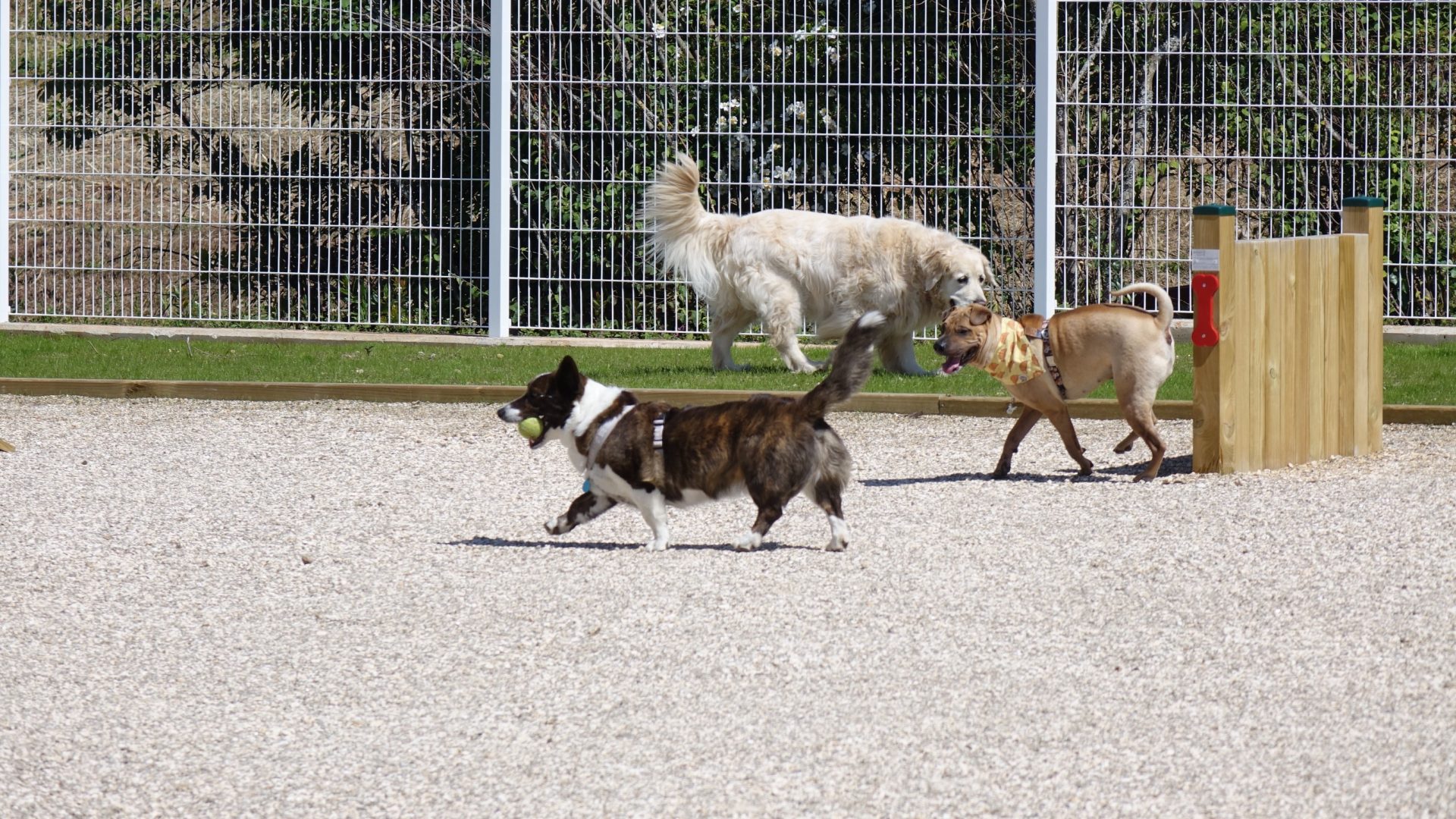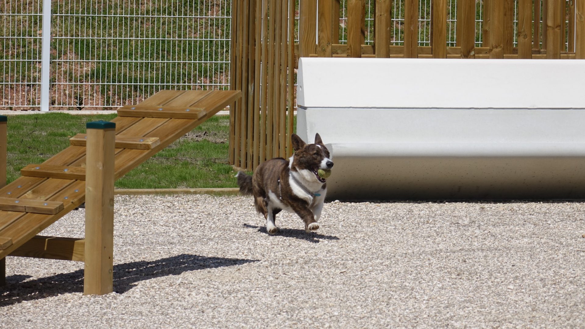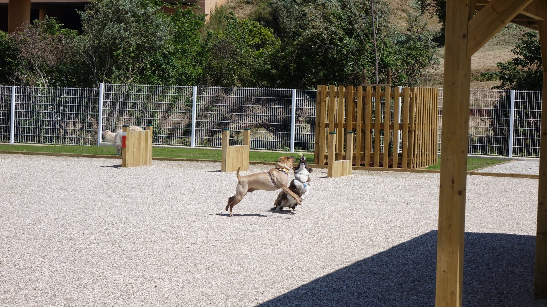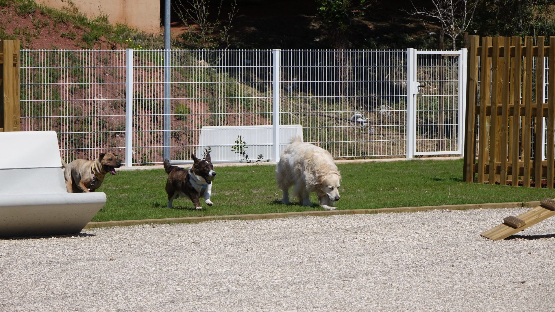 O espaço é totalmente fechado por uma vedação metálica com 1,50m de altura, e nas frentes em que confina com o caminho pedonal está afastado em cerca de 3m, interpondo-se entre o caminho e o parque canino uma faixa verde plantada com sebes arbustivas e árvores de sombreamento. Esta sebe permite maior separação visual exterior/interior, evitando potenciais conflitos entre os animais. Os dois espaços de recreio canino são sombreados por árvores, as quais foram protegidas por uma vedação em madeira de 3x3m, assegurando desta forma o seu pleno desenvolvimento sem agressões provocadas por elevada concentração de urinas, distúrbios do sistema radicular por escavação ou pisoteio. Complementarmente, foi colocado um elemento de sombreamento do tipo pérgula, em madeira, e vários bancos em betão para usufruto dos donos dos animais.