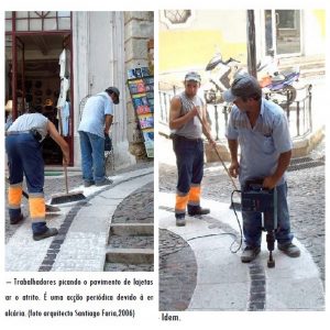Estas fotografias são de 2006, na Rua do Arco de Almedina, mas era operação comum em todo o percurso do Quebra Costas. As imagens são de repetidas ações de picagem do pavimento a fim de aumentar o atrito e prevenir quedas.