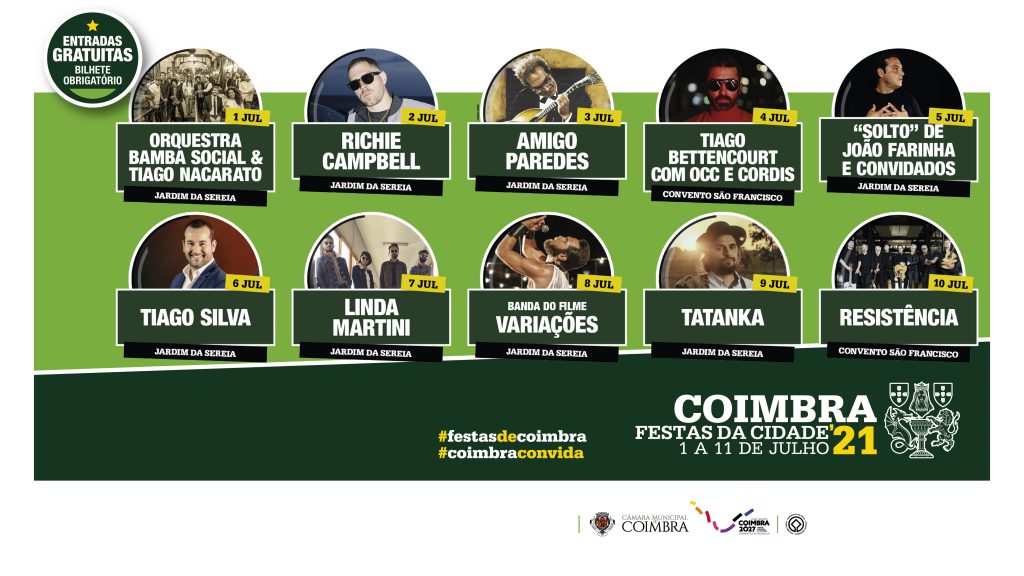 Um cartaz transversal, de grande relevância cultural, mas cuja principal caraterística é valorizar o que é de Coimbra. Assim, aos projetos de maior destaque da cena musical nacional, somam-se três projetos musicais de artistas da cidade que estas celebrações vão ajudar a promover: “Amigo Paredes” (3 de julho), “Solto” de João Farinha e convidados (5 de julho) e Tiago Silva (6 de julho).