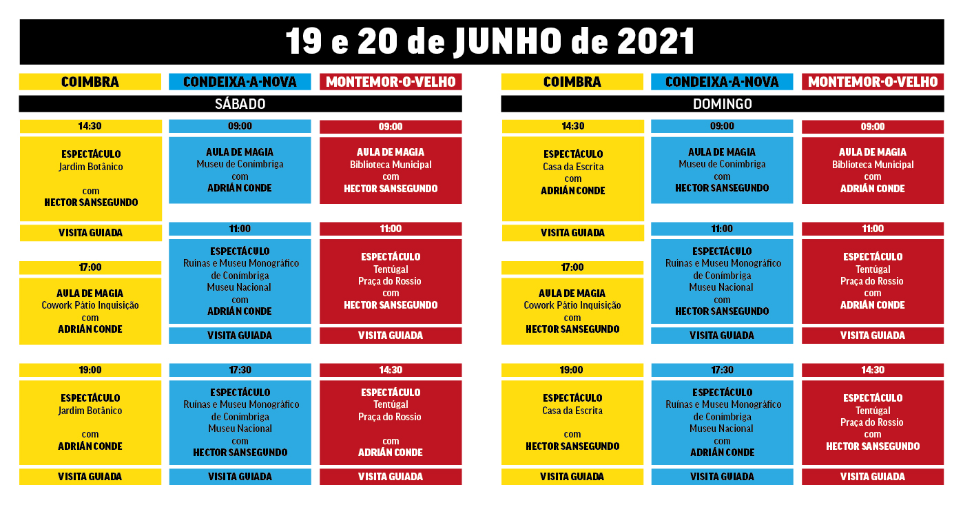 Os “Sítios Mágicos” prosseguem este fim de semana, dias 19 e 20 de junho, com as últimas aulas de magia da Turma 2 a decorrerem no espaço “Cowork Pátio”, situado no edifício da ala central do Antigo Colégio das Artes, no Pátio da Inquisição. Os espetáculos e as visitas guiadas também fazem parte do programa e, neste fim de semana, vão decorrer sábado no Jardim Botânico da Universidade de Coimbra e domingo na Casa da Escrita, com sessões às 14h30 e às 19h00. Em Condeixa, as sessões vão realizar-se nas Ruínas e Museu Monográfico de Conímbriga, às 11h00 e às 17h30, e em Montemor-o-Velho, na Praça do Rossio – Tentúgal, às 11h00 e às 14h30.