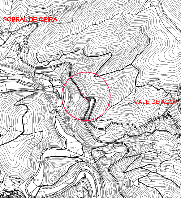 A zona a tratar apresenta uma área de 2784m2, em que a estrada principal tem um desenvolvimento de 230m, sobrepondo-se parcialmente ao antigo traçado. No que diz respeito à correção da curva, no traçado em planta, essa tem um raio de 40m e passará a ter um raio de 104m, melhorando bastante a visibilidade dos veículos provenientes do entroncamento Vale de Açor – Sobral de Ceira.
