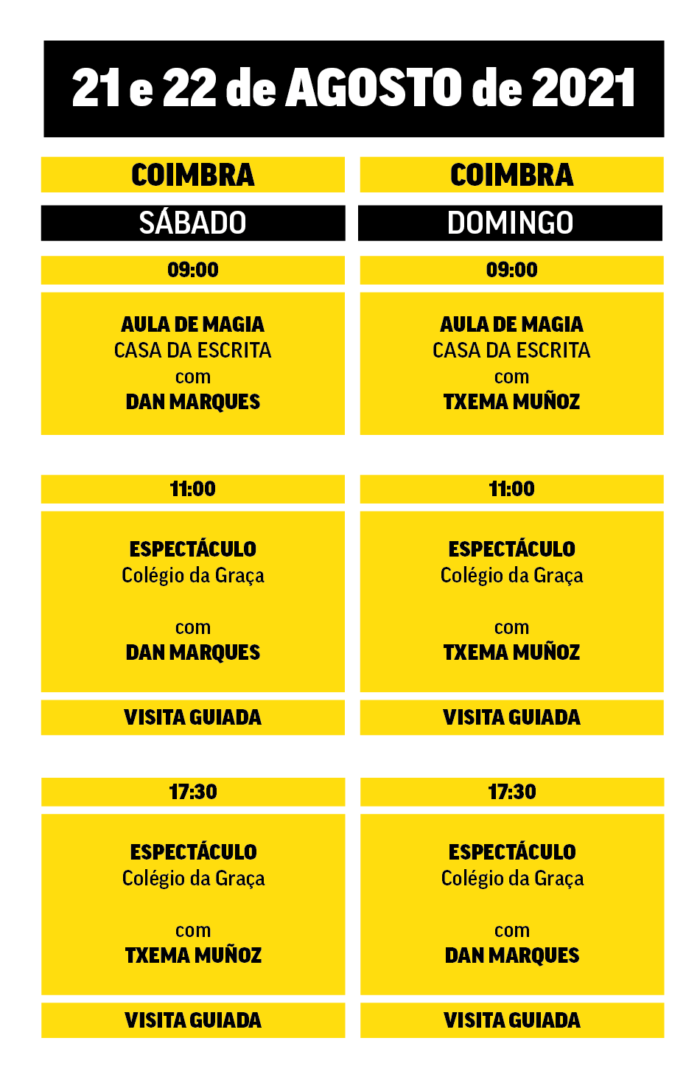 As Escolas de Magia tiveram início no passado dia 24 de abril, nos três concelhos, e terminam agora, este fim de semana, no domingo, dia 22 de agosto. Durante estes quatro meses, cada concelho acolheu quatro turmas de aprendizes, compostas por 10 alunos matriculados nas escolas dos respetivos concelhos. Recorde-se que das quatro turmas de cada um dos municípios parceiros serão selecionados alguns alunos para participarem nas Galas de Magia, que se irão realizar em setembro, em Coimbra, Condeixa e Montemor. A Gala de Magia em Coimbra será no dia 17 de setembro, às 21h30, no Convento São Francisco. A entrada é gratuita, mediante reserva na Ticketline.