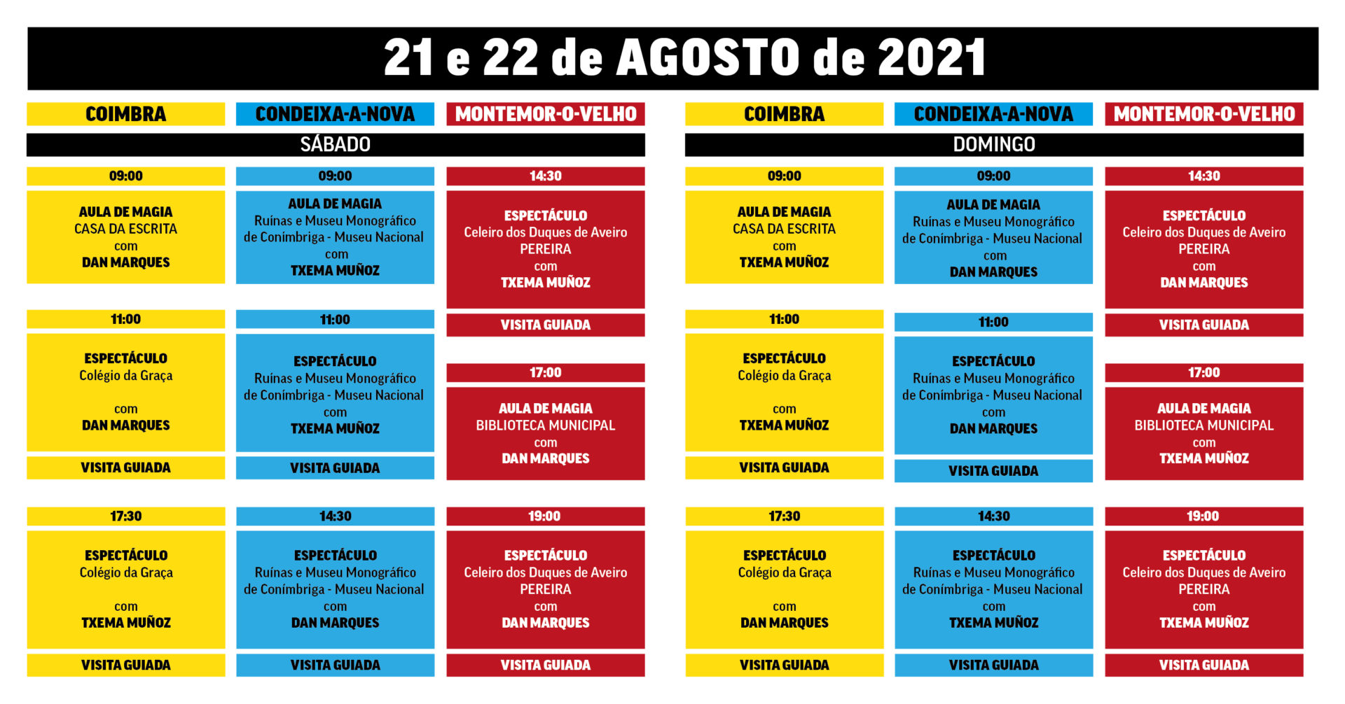 A animação do próximo fim de semana está mais uma vez garantida com a programação dos “Sítios Mágicos” em Coimbra, Condeixa e Montemor. A turma 4 vai ter o último fim de semana de aulas, que continuam a decorrer na Casa da Escrita. Já os espetáculos de magia vão decorrer no Colégio da Graça, quer no sábado, quer no domingo, pelas 11h00 e pelas 17h30. Em Condeixa, as sessões vão realizar-se nas Ruínas e o Museu Monográfico de Conímbriga – Museu Nacional, às 11h00 e às 14h30, e em Montemor, no Celeiro dos Duques de Aveiro – Pereira, às 14h30 e às 19h00, em ambos os dias.