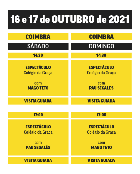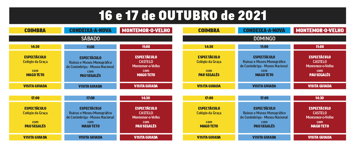 Os “Sítios Mágicos” regressam este fim de semana, 16 e 17 de outubro, a Coimbra, Condeixa-a-Nova e Montemor-o-Velho. Visitas guiadas e espetáculos protagonizados por mágicos internacionais marcam mais dois dias de animação nos três concelhos, desta vez com a presença de Mago Teto e Pau Segalés. Em Coimbra, os espetáculos de magia vão decorrer no Colégio da Graça, às 14h30 e às 17h00, no sábado e no domingo. As entradas são gratuitas, mas é obrigatória a reserva através da Ticketline.