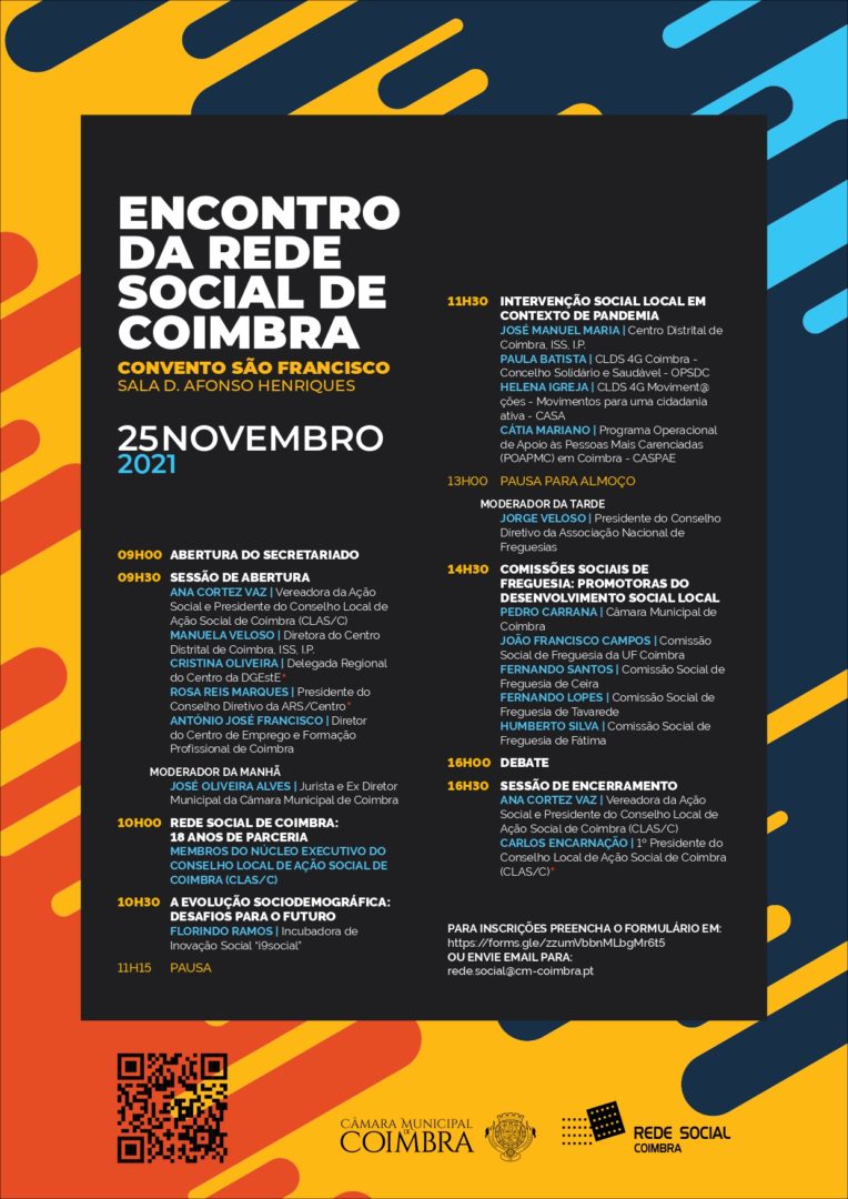 O “Encontro da Rede Social de Coimbra” pretende abordar diversas temáticas, designadamente a evolução da Rede Social e a consolidação das parcerias, os desafios futuros perante a evolução sociodemográfica, a intervenção social em contexto de pandemia, bem como o papel das comissões sociais de freguesia na promoção do desenvolvimento local.