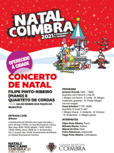 É este o quinteto que irá interpretar duas obras-primas de Dvorák e Schubert, este domingo, no concerto de Natal oferecido pela CM Coimbra. O concerto vai decorrer no Salão Nobre dos Paços do Concelho, estando asseguradas o arejamento, a limpeza e a higienização do espaço antes e depois do evento.