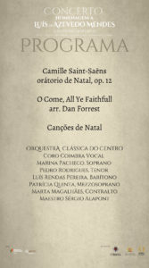 Neste concerto será interpretada a “Oratória de Natal” do compositor Camille Saint-Saëns, no ano em que se assinalam os 100 anos do seu desaparecimento. Obra que teve a sua estreia a 24 de dezembro de 1858, na Igreja de La Madeleine, em Paris, sob a direção do próprio compositor. Serão ainda interpretados alguns temas alusivos à época de Natal, como “Adeste Fidelis” ou “Silent Night”. Destaque para a participação de solistas de renome nacional e internacional, como Patrícia Quinta, Marta Magalhães, Luís Rendas Pereira, Pedro Rodrigues, Marina Pacheco, o Coro Coimbra Vocal e a direção de Sergio Alapont.