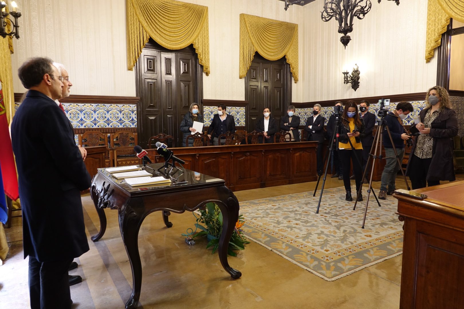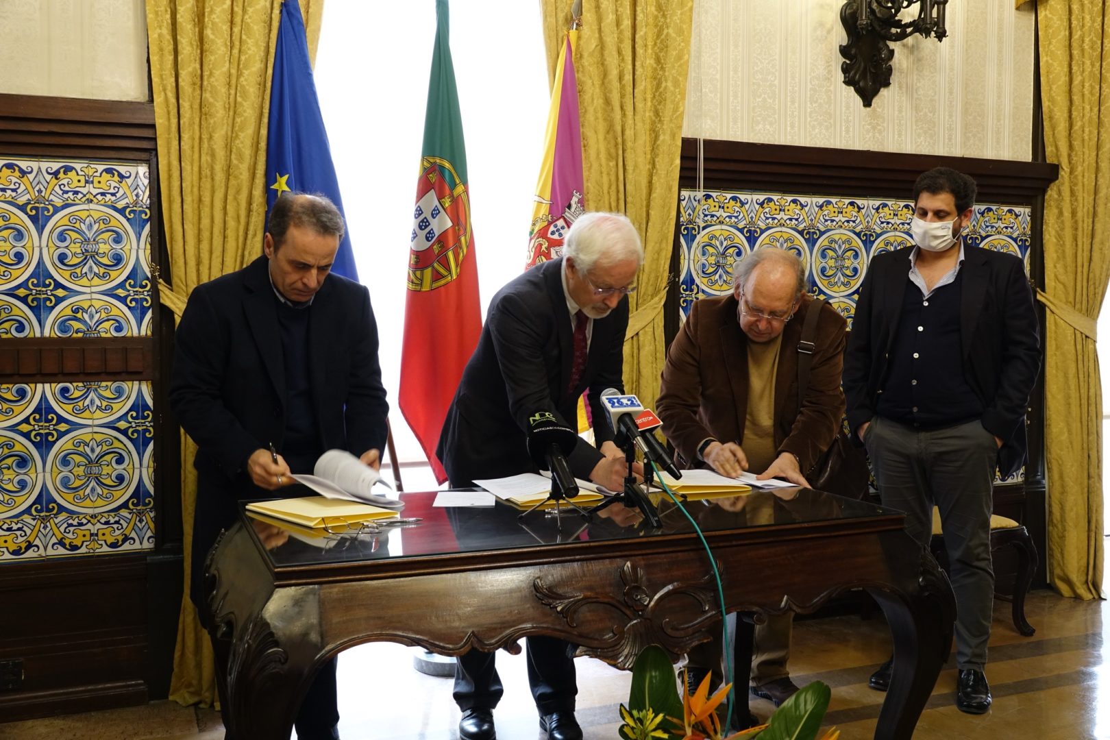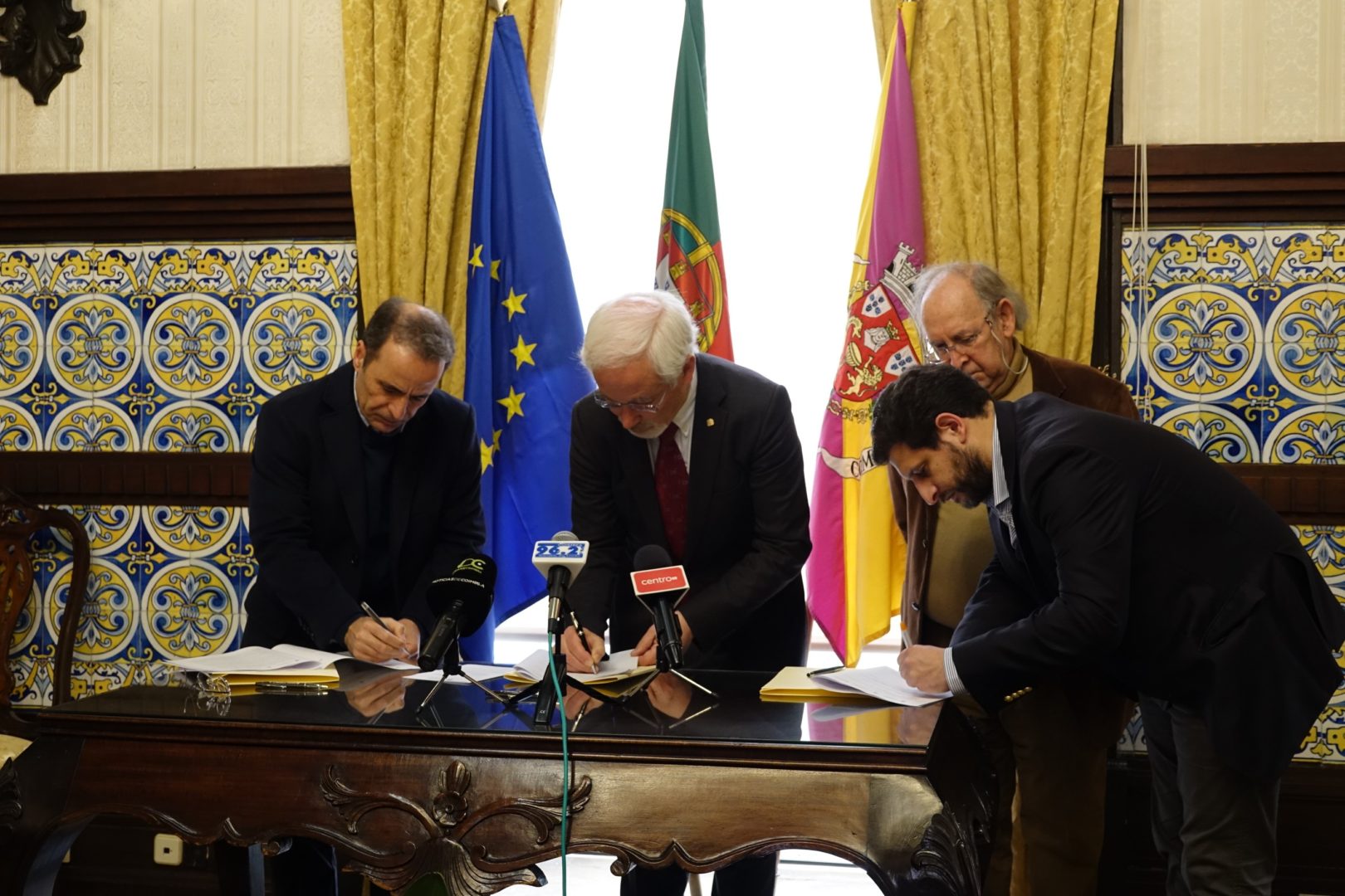 O contrato de cooperação interadministrativa sobre o Jardim Botânico foi esta manhã formalizado pelo presidente da CM Coimbra, José Manuel Silva, pelo reitor da UC, Amílcar Falcão, e pelo presidente e vogal do Conselho de Administração da AC, Alfeu Sá Marques e Filipe Carrito, respetivamente.