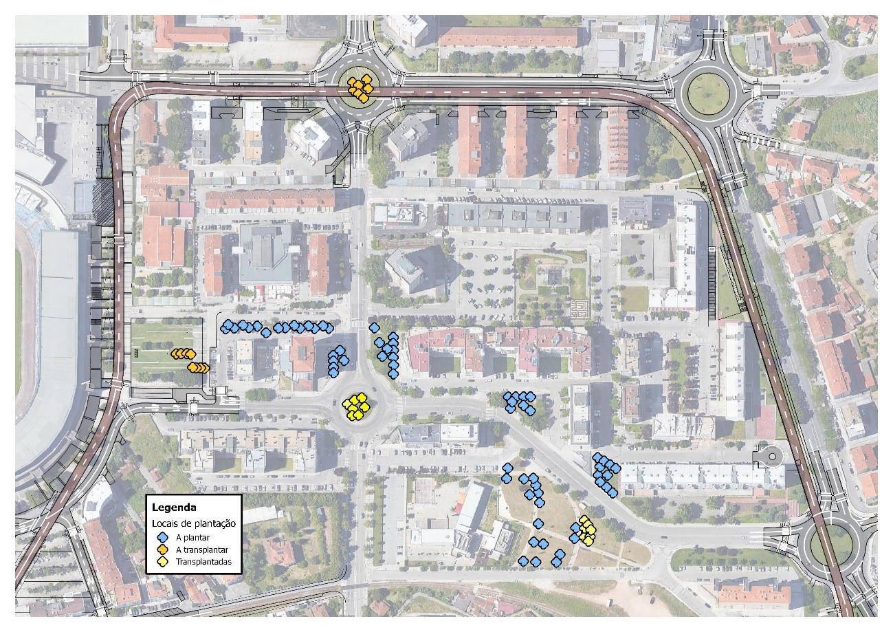 A primeira intervenção está prevista para o último trimestre de 2022, com a plantação de 81 árvores na zona da Solum, conforme se apresenta na imagem abaixo.