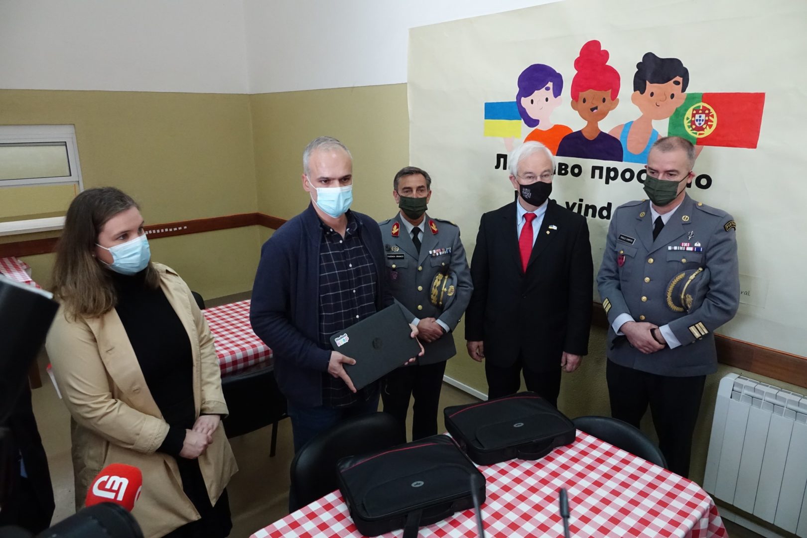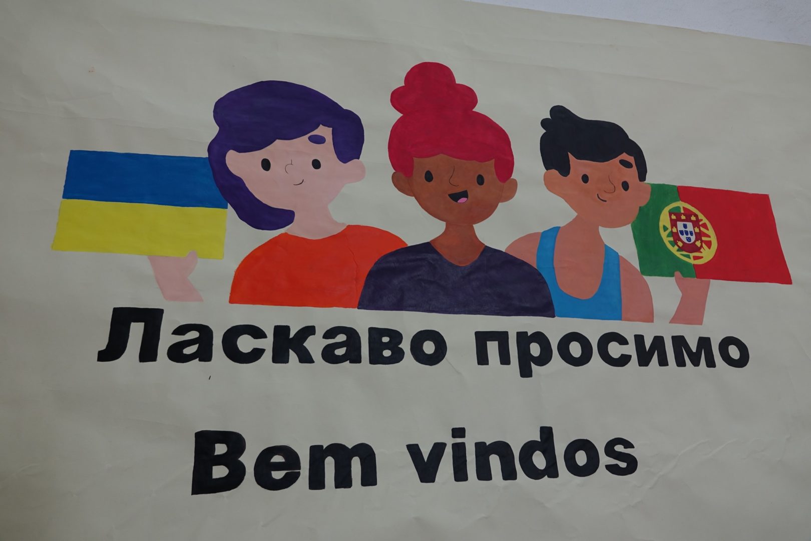 À entrada, as placas bilingues – português e ucraniano – ajudam a identificar os compartimentos, onde, para além de quartos com capacidade para 40 pessoas, existe também uma copa, refeitório e até uma sala de brincar, com inúmeros brinquedos a pensar nos mais pequenos.