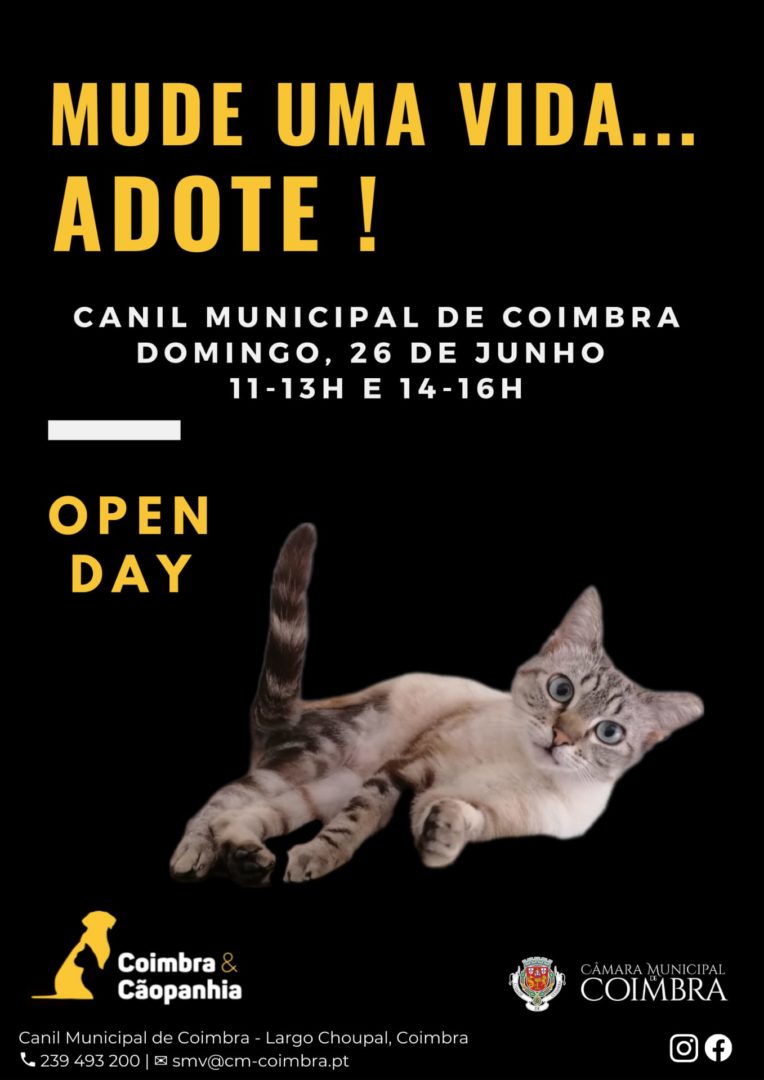 A Câmara Municipal de Coimbra vai promover no próximo domingo, dia 26 de junho, mais um “open day” no Canil Municipal. O canil vai estar aberto ao público das 11h00 às 13h00 e das 14h00 às 16h00 para que todos possam conhecer os animais que se encontram para adoção. O objetivo é mesmo incentivar à adoção, já que no “open day” há isenção de pagamento de taxas de adoção. Os animais são entregues desparasitados, vacinados, identificados, registados e esterilizados e é feita a emissão do respetivo Boletim Sanitário, cumprindo todos os preceitos legais.