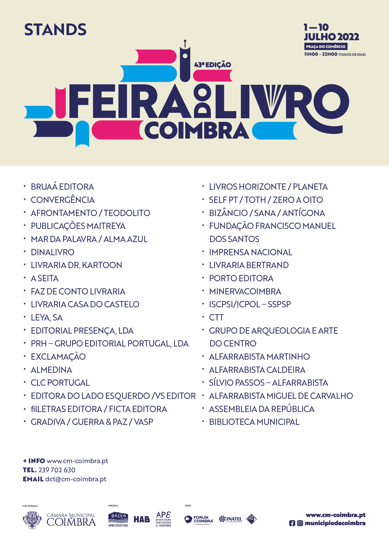 Em pleno período de celebração das Festas da Cidade, a Praça do Comércio acolhe, de 1 a 10 de julho, entre as 11h00 e as 22h00, a 43ª edição da Feira do Livro de Coimbra. A iniciativa integra uma programação abrangente e diversificada, dirigida a todos os públicos. Centrado na promoção do livro e da leitura, com a presença de cerca de três dezenas de expositores e apresentação de obras literárias e debates com vários autores, o evento alarga a sua programação à participação de outras figuras do meio cultural ligadas ao ato poético-literário, como Sérgio Godinho e Filipe Raposo, Hugo van der Ding, Diogo Piçarra, Pedro Lamares e Filipa Leal ou Rodrigo Leão, entre outros. São novidades nesta edição do evento a criação da rubrica “Leituras Zen” (massagens de relaxamento com leituras poéticas) e a inclusão do projeto de economia circular “Book in Loop” (sediado em Coimbra), enquadrados numa área que compreende, além de 40 stands, uma zona lounge e um auditório polivalente.
