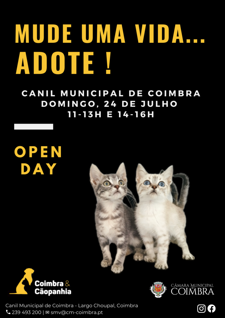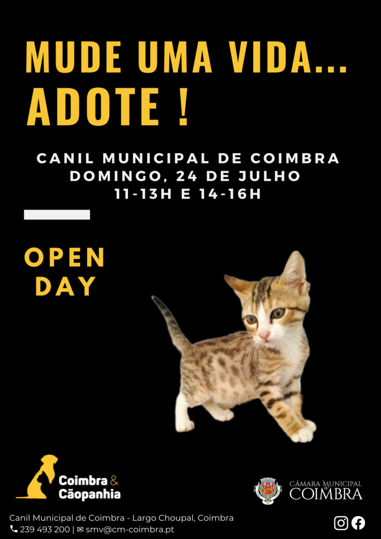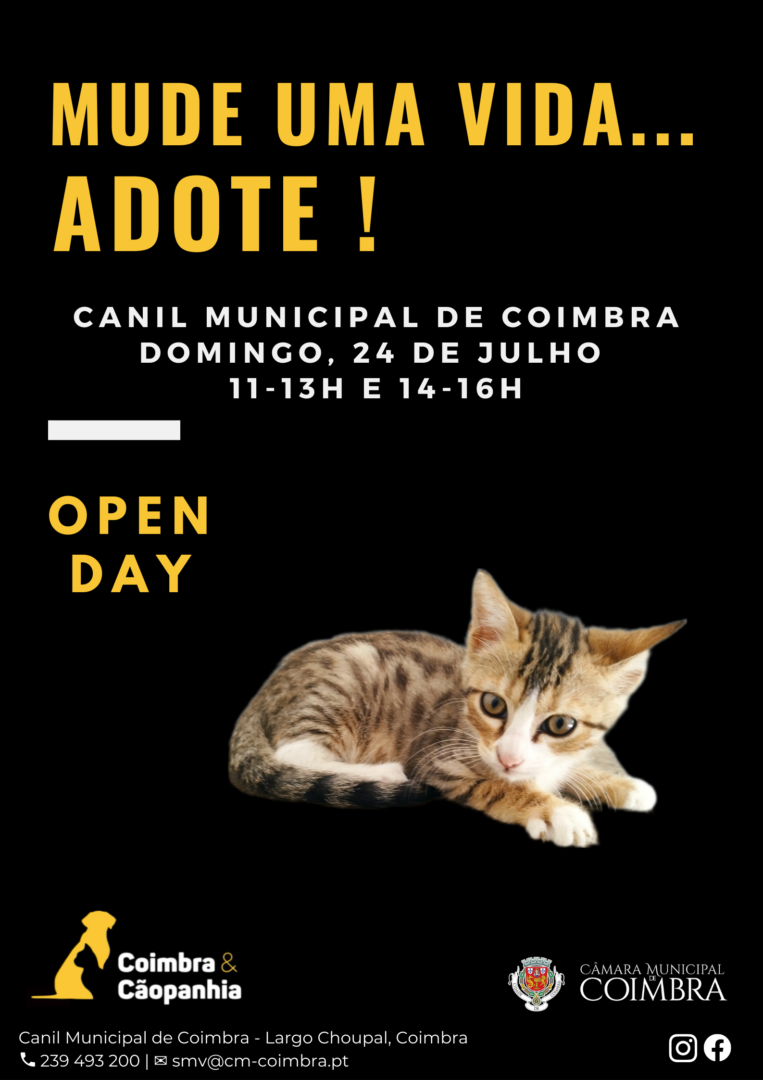 Recordamos que o Canil Municipal de Coimbra se encontra, também, aberto para visitas todos os dias úteis, das 11h00 às 13h00 e das 14h00 às 16h00. Com marcação prévia podem ser agendados outros horários, através do número 239 493 200 ou do endereço smv@cm-coimbra.pt. O Canil Municipal tem ainda previsto a realização de um “open day” por mês, de forma a promover e a fomentar a adoção de animais.