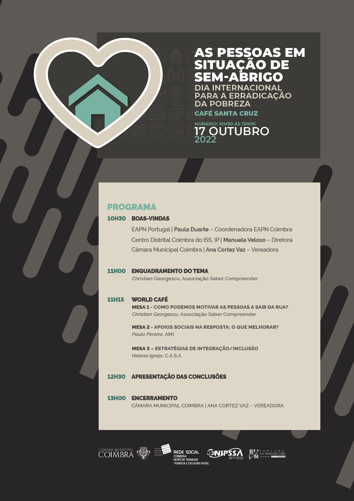 Com esta iniciativa, a CM Coimbra pretende promover a partilha e troca de conhecimento entre as entidades, refletindo sobre experiências, motivações, necessidades e estratégias utilizadas no trabalho desenvolvido com a população em situação de sem-abrigo. O “World Café” destina-se, sobretudo, às instituições que integram o NPISA – núcleo criado em janeiro de 2019 e formalizado apenas este ano pela CM de Coimbra, no âmbito da Estratégia Nacional para a Integração de Pessoas em Situação de Sem-Abrigo (ENIPSSA), mas vai contar, também, com a participação de pessoas que estiveram ou estão em situação de sem-abrigo.